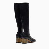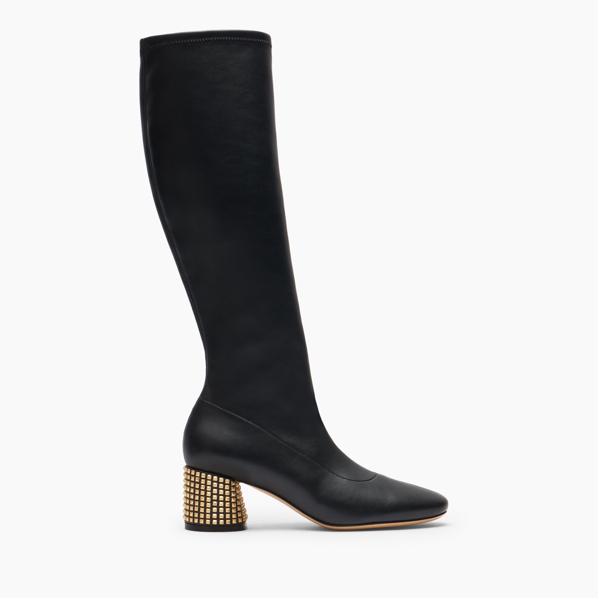 The Goldmember knee-high boot lights up with personality thanks to the chunky heel entirely decorated with pyramidal studs to sparkling effect. A jewel detail with a rock-chic flair, transforming the heel into a sophisticated sculpted spotlight. The metallics create vibrant reflections at every step, adding grit and sophistication to the essential black leather silhouette. A model designed for those who love to stand out in style, combining femininity and character in a perfect balance. Details - Stretch vegan nappa leather with a sporty and distinctly natural look - 60% Polyurethane and 40% Polyester - Steel heel covered with studs 50 mm / 1.9 inches - 100% Made In Italy - Code: 1S383A0501C28999000