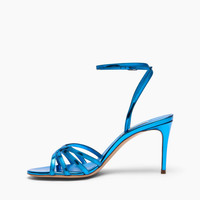 The Julia sandal, presented in a mirrored fabric on a smurf-coloured metallic base, is a tribute to sophisticated femininity. The thin straps intertwine harmoniously on the foot, creating a play of fluid lines and luminous reflections, while the 8cm stiletto heel adds height with elegance. The thin, shiny ankle strap adds a refined and sensual touch, while ensuring stability and comfort. A model designed to brighten up special occasions and get you noticed discreetly, without sacrificing a minimalist and modern aesthetic. Perfect for elegant evenings, exclusive events, or red-carpet looks, it’s the ideal shoe for those who want to shine and stand out with style. Details - Mirror-effect fabric on metallic backing - 40% Polyester and 60% Polyurethane - Thin Heel Covered In Mirror-Effect Fabric 100 Mm / 3.1 Inches - 100% Made in Italy - Code: 1L420B0801INTER5411