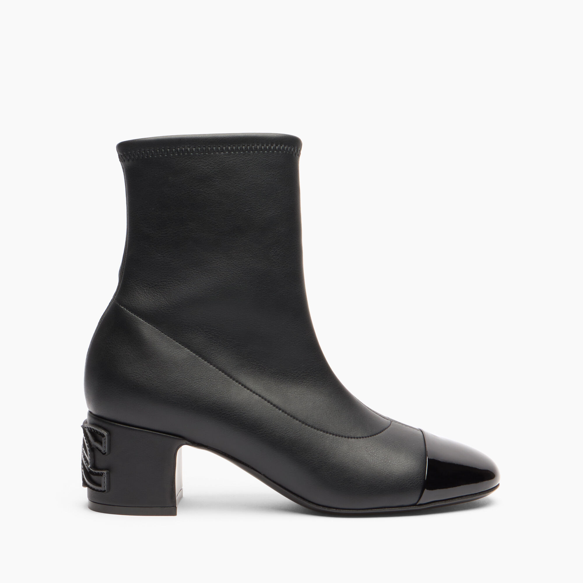 Clean lines, black leather and a touch of glossy patent leather on the toe define the perfect balance between essentiality and character. This ankle boot is distinguished by its chunky 5 cm heel, made unique by the iconic inlaid logo: a graphic and recognizable detail that turns functionality into style. The patent leather toe adds a glossy and sophisticated note, accentuating the material duality of the model. Ideal to wear in the office with a modern-cut suit, perfect with denim or midi dresses for a day-to-night look, this ankle boot is the perfect synthesis of functionality and identity. Details - Patent leather, stretch vegan nappa leather - 50% Calf, 30% Polyurethane and 20% Polyester - Leather covered heel with the C-Chain inlay 50 mm / 1.9 inches - 100% Made In Italy - Code: 1R534A0501T04409000