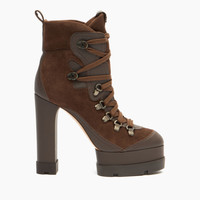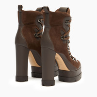 The Nancy ankle boot with platform in cocoa-coloured suede and smooth ton-sur-ton leather inserts is a metropolitan ankle boot on a rubber tank bottom. The vertiginous chunky heel is balanced by a sturdy platform to guarantee stability and practicality. The lace-up fastening detail with small metal hooks makes this model perfect for tackling winter with style and character. Details - Suede - 100% Calf - Leather covered heel 120mm/4.7 inches with plateau 40 mm/1.5 inches - 100% Made In Italy - Code: 1R538A1201NOMAD2403