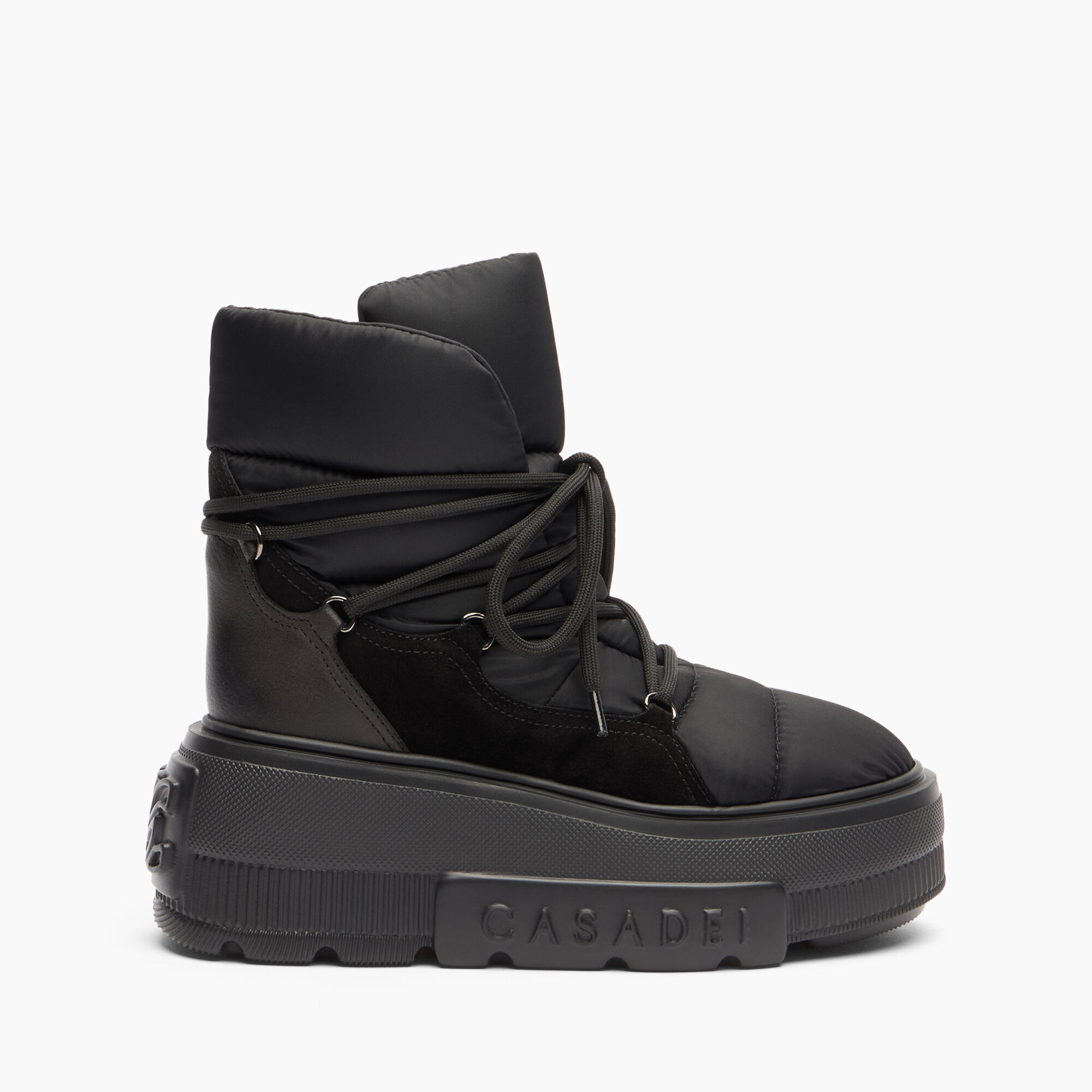 Maison Casadei ensures for its customers a cool look even for colder climates. This lace-up boot in suede calfskin and black padded nylon is the ideal ally for enhancing winter outfits. The comfortable Nexus bottom made of extra-lightweight material ensures stability and practicality, as well as grip. Details - Padded nylon, suede calfskin leather - 50% Nylon and 50% Calf - Ultra-light wedge with the Casadei logo on the outside and C-chain logo underneath the sole 70 mm / 2.7 inches - 100% Made In Italy - Code: 2X091A070NT05649000