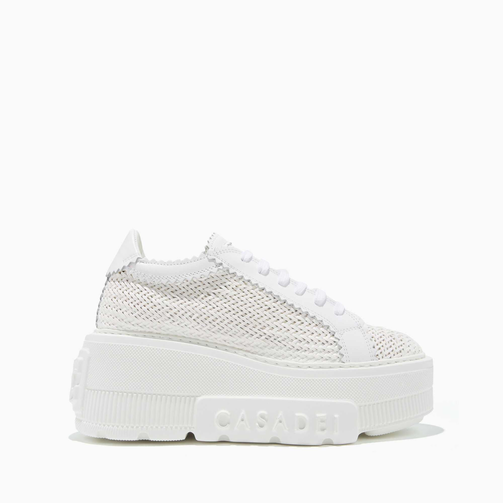 These White-coloured Hanoi Nexus sneakers have been crafted from innovative materials, such as the extra-light wedge heel and vegan leather, and boast a modern design. These are a creation with a techno-futuristic background and current aesthetics that make it a must-have for the season. Details - Interwoven vegan leather strips - 25% Calf Leather and 75% Polyurethane - 70-Mm/2.7-Inch Ultra-Light Wedge With The Casadei Logo On The Outside And C-Chain Logo Underneath The Sole. - 100% Made In Italy - Code: 2X896U0701HANOI9999