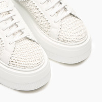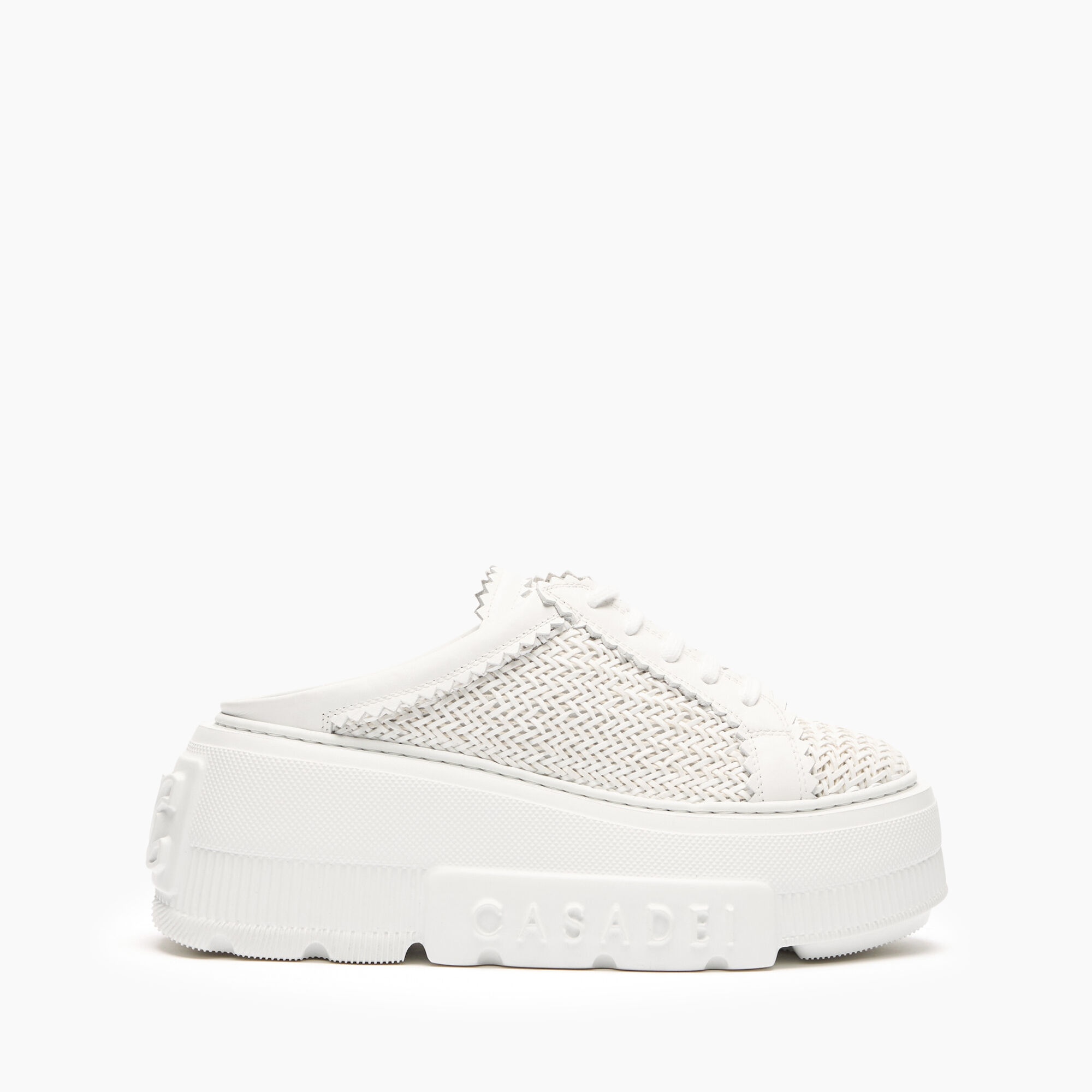 For Nexus sneaker lovers, Casadei offers for this Spring/Summer25 the sabot sneaker in white vegan vegan leather raw cut woven stripes. Ideal for summer outfits without sacrificing comfort and style. Details - Synthetic woven - 100% Polyurethane - Ultra-Light Wedge With The Casadei Logo On The Outside And C-Chain Logo Underneath The Sole In 70 Mm / 2.7 Inches. - 100% Made In Italy - Code: 2X068J0701HANOI9999