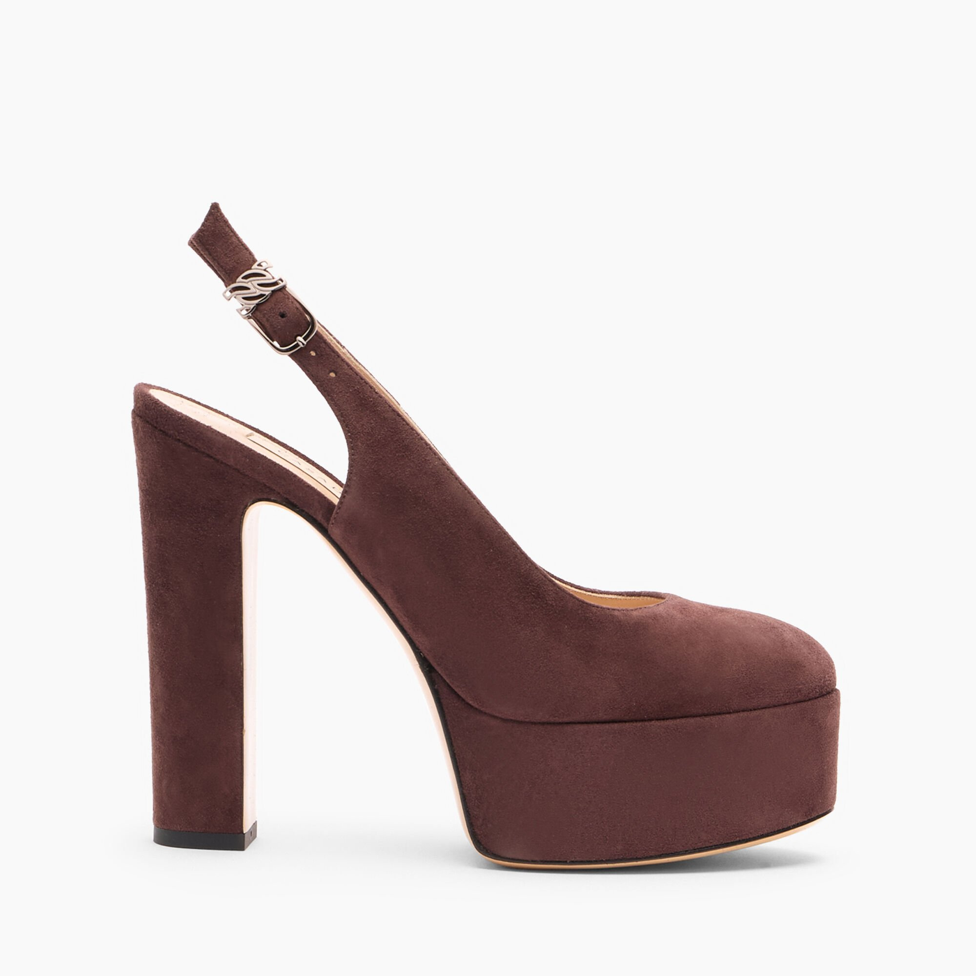 For lovers of heights, Casadei presents for this Fall/Winter 25-26 collection the new Patty plateau. Reminiscent of the 1970s, the 8cm quarry plateau addresses the theme of “beautiful and walkable” with style and panache. In carob-colored suede, this elegant slingback features a chunky 13cm heel, balanced by the comfortable plateau that slims the figure. The small C-Chain buckle makes this model one of a kind. Details - Suede - 100% Kid - Leather covered heel 130 mm / 5.1 inches with plateau 30 mm / 1.18 inches - 100% Made In Italy - Code: 1G659A1301CAMOS2413