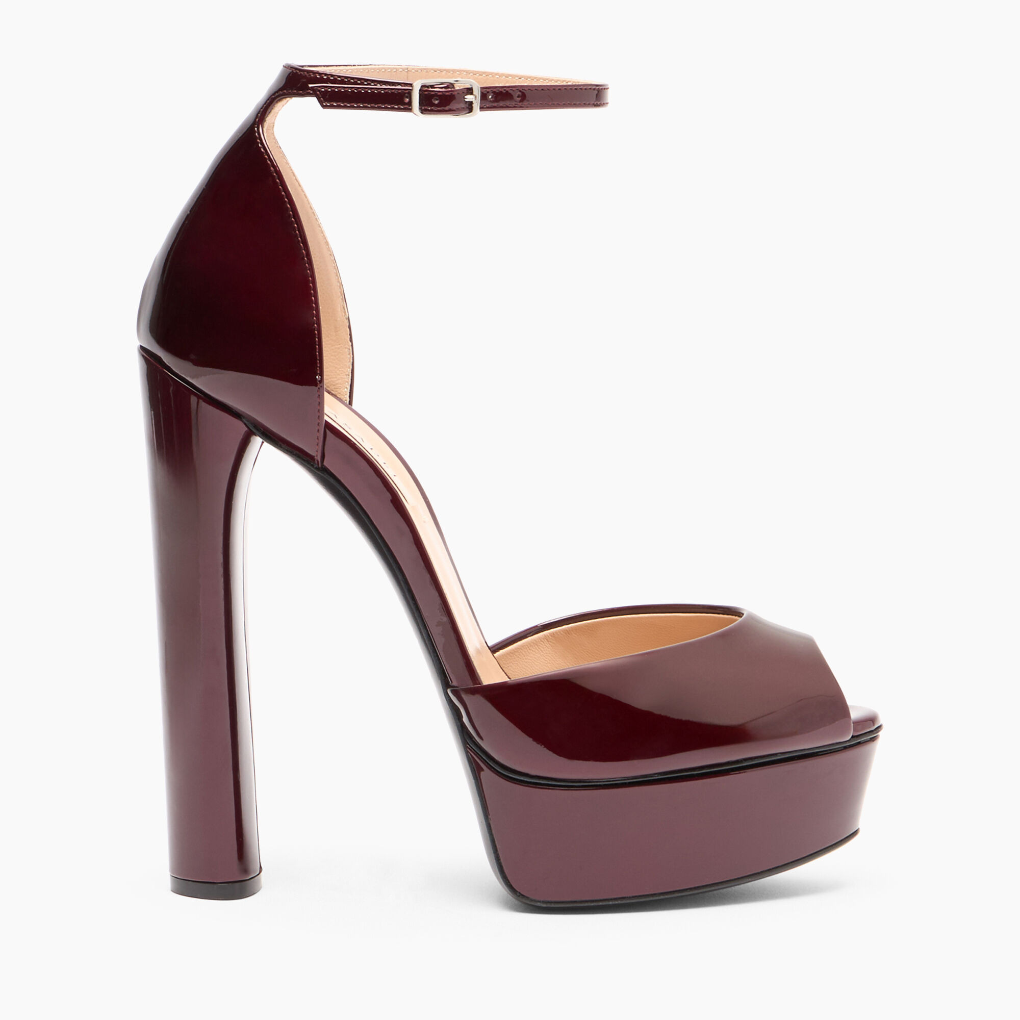 For those who love heights, Casadei presents its iconic Flora platform in samurai, a black cherry-colored patent leather that features a delicate metallization that can enhance the model's colors and shine. This sandal, featuring a vertiginous chunky heel well balanced by a comfortable platform, secures at the ankle with a thin strap. It enhances the feminine silhouette, imparting sensuality and elegance. Details - Patent leather with soft metallic finish to highlight the colour and brilliance - 100% Calf - Patent leather covered heel 140 mm / 5.5 inches with plateau 40 mm / 1.5 inches - 100% Made In Italy - Code: 1L287Y1401SAMUR4408
