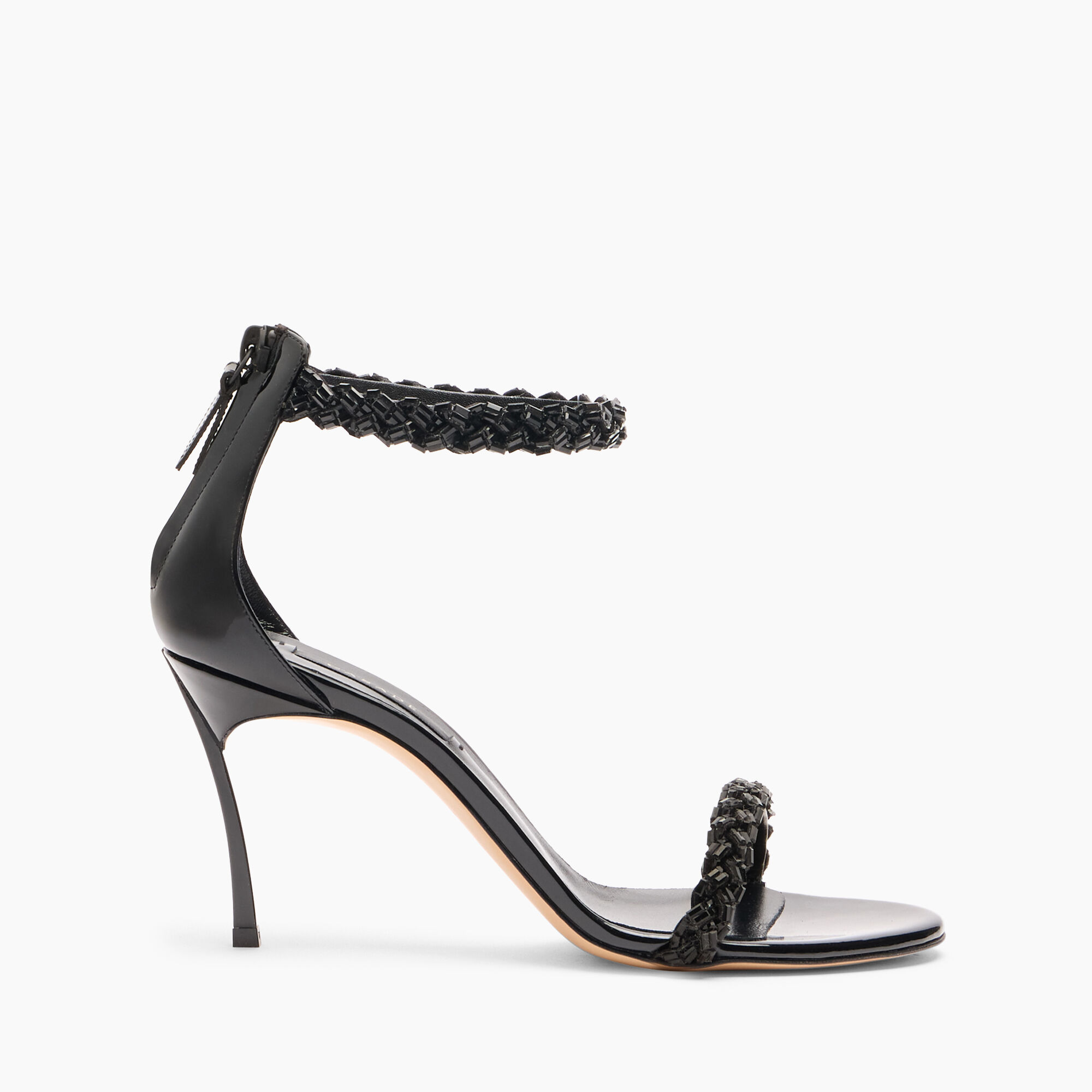 Let the Starsway world seduce you! Elegant black patent leather sandal enriched with braids of shiny ton sur ton material that light up your every step. Can't miss the iconic 8 cm hardened Blade heel, as sharp as a knife blade, which gives strength and character to the model. It features a zipper that ensures the fit. Details - Patent leather - 100% Calf - Blade heel in stainless steel 80 mm / 3.1 inches - 100% Made In Italy - Code: 1L396A080TT05289000