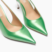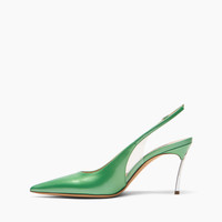 For Spring/Summer 2026, Maison Casadei presents the iconic Superblade slingback in emerald metallic patent leather with an 8 cm Blade heel, designed to meet the needs of busy women who still want to look feminine and sensual. The vinyl detail adds lightness to the shoe. Designed for women who want to feel strong and flawless on every occasion—from elegant evenings to the most special moments. A shoe with a bold character, ideal for those who love the perfect balance between power and femininity. Details - Patent leather - 100% Calf - Blade Heel In Stainless Steel. 120 Mm/ 4.7 Inches. - 100% Made in Italy - Code: 1G590X080MC29246706