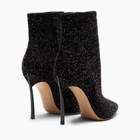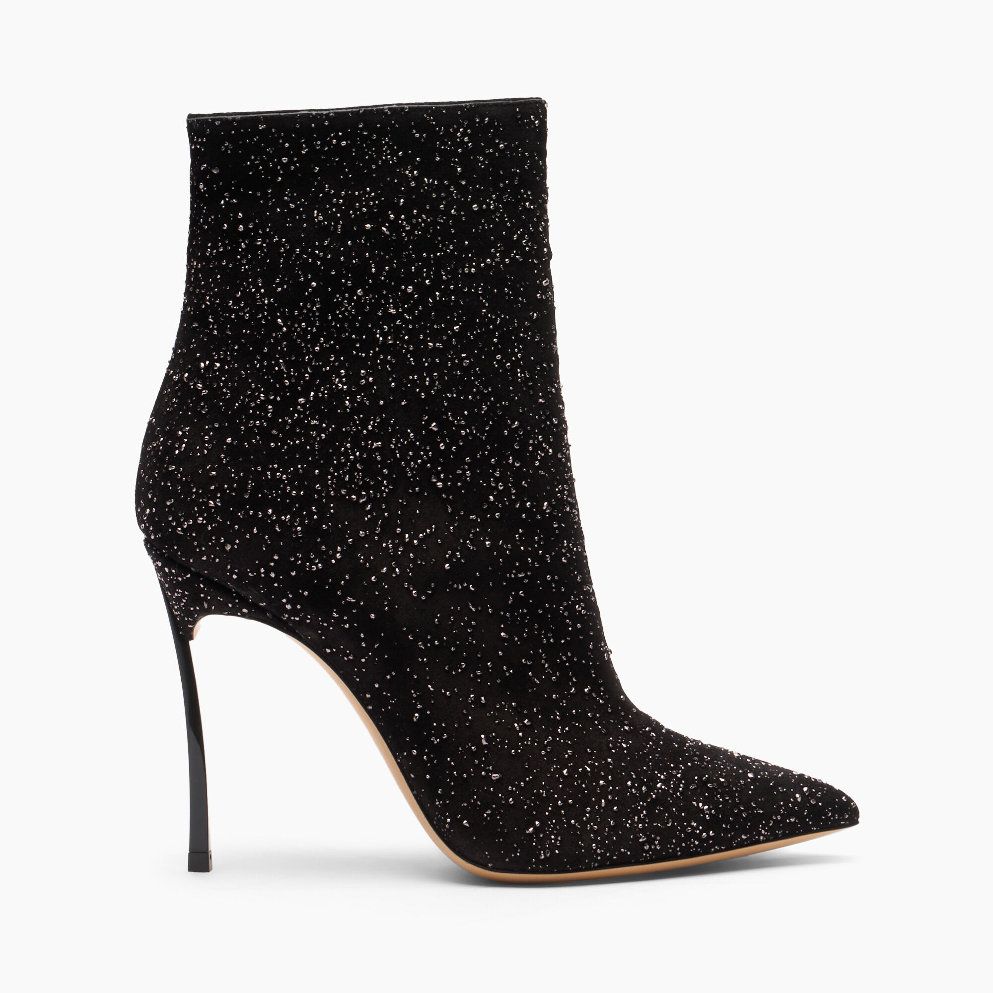 The Universe ankle boot cannot be missing from your winter wardrobe. With a refined and sensual silhouette, this black suede model with metallic stone appliques is able to catch the light and reflect every glow. The Maison's iconic Blade heel in hardened steel lends froza and character to the style. It features a side zipper. Details - Suede with irregular applications of metallic stones - 100% Calf - Blade heel in stainless steel 100 mm / 3.9 inches - 100% Made In Italy - Code: 1Q210A100TUNIVE9000