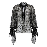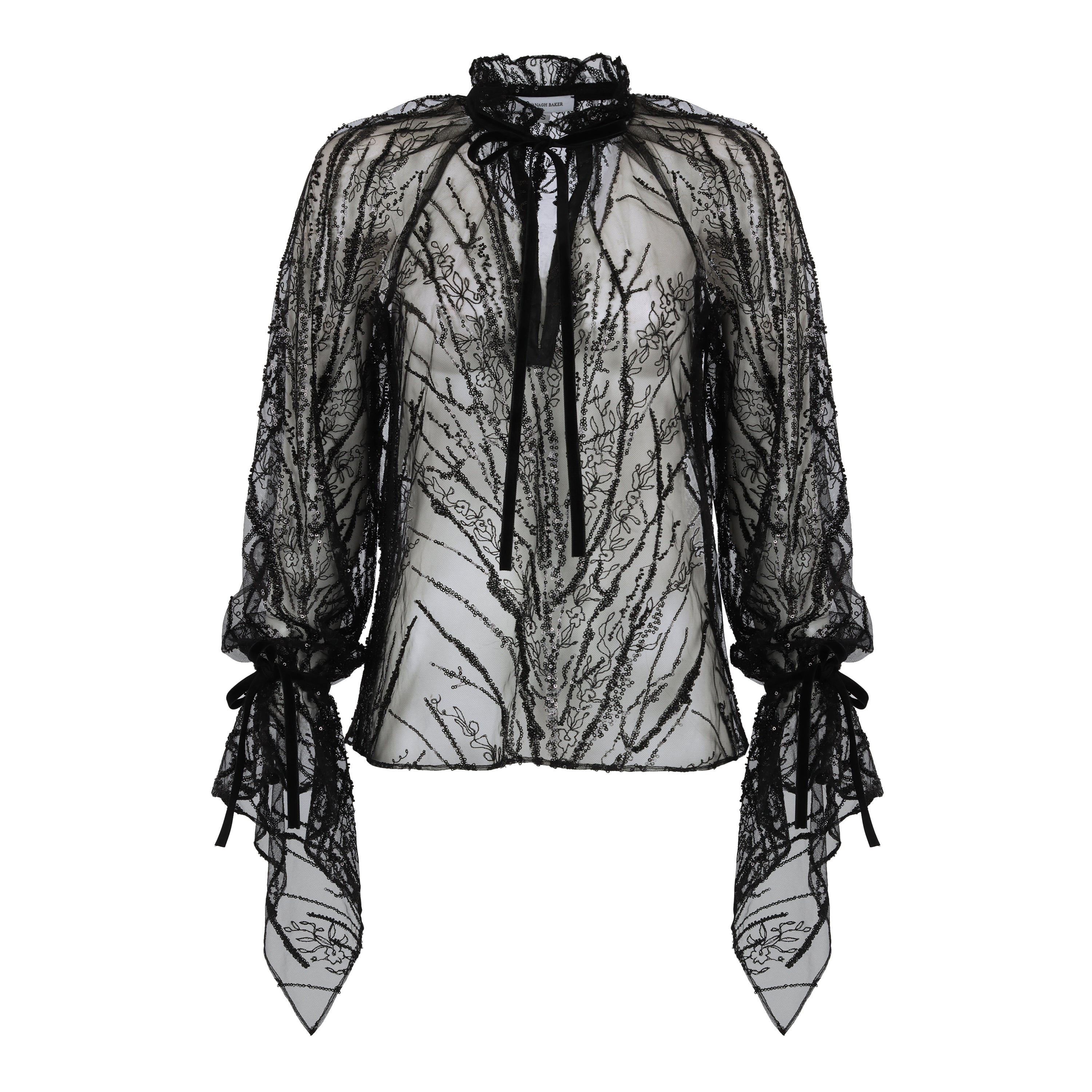 Elevate your wardrobe with our Beaded Long Sleeve Blouse , crafted from exquisite, intricately beaded netting for a luxurious, high-fashion allure. Designed for the modern, sophisticated woman, it features elegant raglan full sleeves with dramatic draped cuffs, enhanced by delicate 1/4" velvet trim for a touch of timeless refinement. This statement piece effortlessly balances bold design with classic elegance, making it perfect for those who seek distinctive, couture-inspired style. Whether paired with tailored trousers or a flowing skirt, this blouse redefines sophistication for the discerning luxury fashion connoisseur. Made in NYC Material: Double silk chiffon Beaded netting Raglan Sleeve Unlined Velvet trim