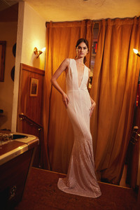Made to Order: Hand placed Swarovski Crystals on mesh, our ombre crystal gown is perfect for the classic bride who wants to add a bit of color. Featuring a plunging V neckline and a fitted skirt with a mermaid tail. Made in New York City Hand placed crystal fishnet Fully lined Invisible zipper Delivery between 4/1/23-4/15/23 Sizing : XS-XXL