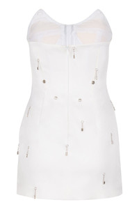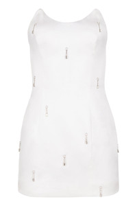 Made to order. Architectural inspired, our Millie Bow Dress is an absolute show stopper, not to mention, a two in one dress. Wear this dress in full, or remove the modern oversized silk charmeuse bow for the perfect simple cocktail mini dress. Made from luxurious silk velvet, hand sewn crystal fringe paired with an interior corset for extra control and fit. You are sure to turn all heads, wherever you go. Available in black DETAILS Made in NYC Material: Silk Velvet silk lining Netting Pads Metal Boning Fitted Exposed zipper SIZING XS, S, M, L, XL Care Instructions Dry Clean Only Please allow 4-6 weeks for garment to be made. Garment can be expedited for a fee