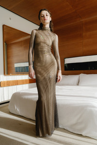 Luxurious, liquid, classic. Our Ombre Crystal Fishnet Gown is made from thousands of hand placed crystal on hand woven elastic fishnet, made in only one factory in the world in Italy. The color gradates from from nude to grey and finish in black. Attached to nude fishnet and lined in nude netting to give a light, liquid look. This garment is only made to order and is handmade in Italy. Hand made in Italy Crystal Elastic Fishnet Invisible Zipper Unlined Sleeves Lined Body Netting Fitted Sizing XS-XXL Please allow 12 weeks for garment to be made, colors can be customized.