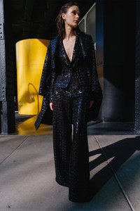 The wide legs and slightly higher waistband of the Taylor make anyone who puts them on look (and feel) inches taller. Our luxurious Italian navy and black tweed with a plaid sequin overlay features our signature yolk detailing and patch pocket with a wide leg hem. Pair with the matching Fitted Blazer and Coco Jacket DETAILS Made in NYC Material: Tweed and sequin Fully Lined 1-inch band sits at natural waist Outside patch pocket Yolk detailing Wide leg hem Invisible zipper in center back SIZING XS-XL CARE Dry clean only