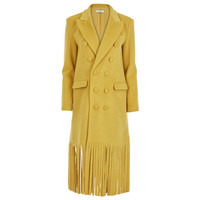 This fringed tuxedo coat is a bold statement piece that effortlessly blends classic sophistication with modern flair. Featuring a relaxed, oversized fit, it offers comfort without compromising style, making it perfect for both day and evening wear. The double-breasted design adds a tailored touch, while the dramatic fringe detail along the hem and sleeves brings a unique, playful element. Crafted from luxurious materials, this coat exudes elegance and exclaims confidence with every movement. Perfect for those seeking to make a statement, this coat is a must-have for any fashion-forward wardrobe. Also available in black Made in New York City Wool Cashmere Covered Buttons Fully Lined Shoulder Pads