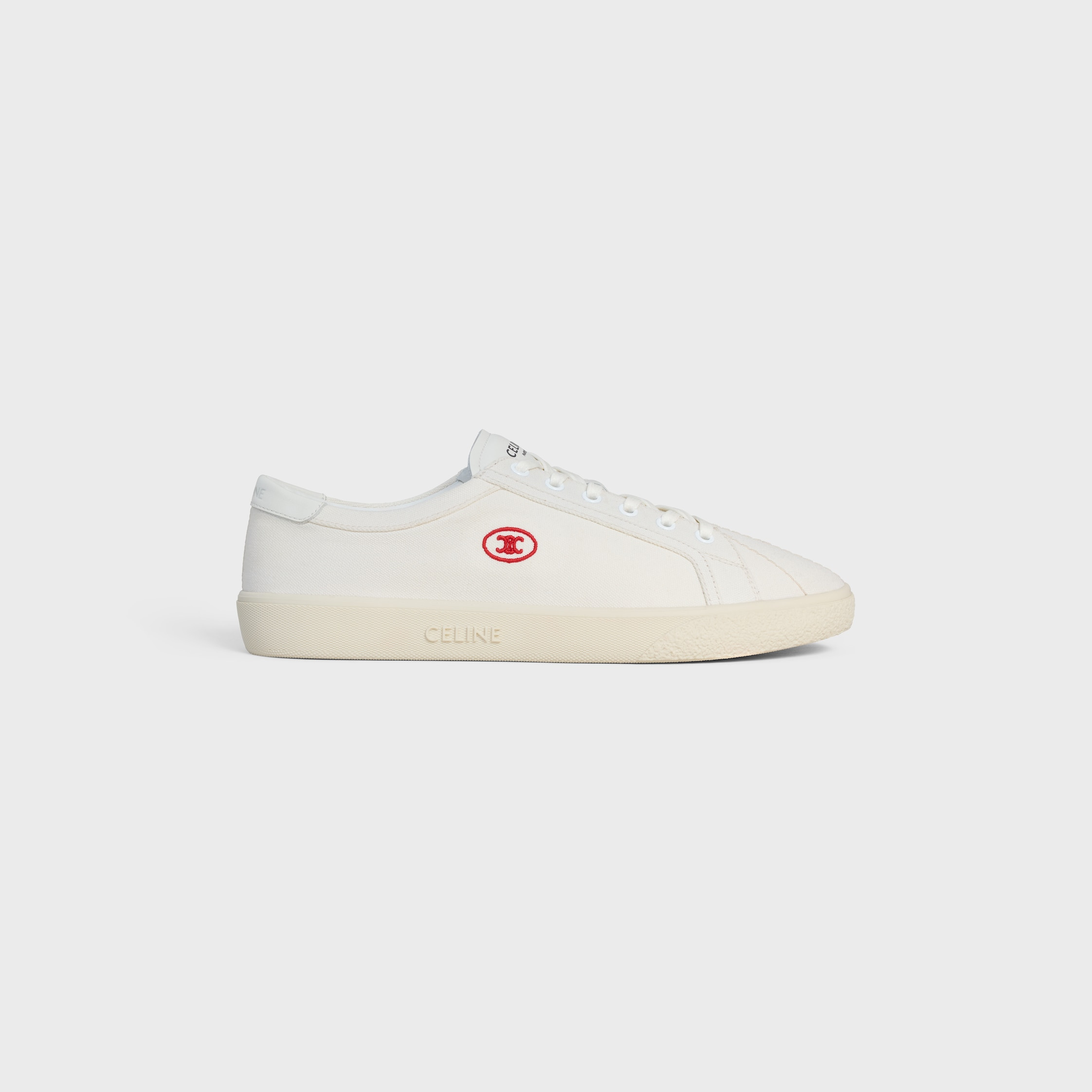 DETAILS 85% TEXTILE 15% CALFSKIN 0.2 IN (5 MM) HEEL EMBROIDERED TRIOMPHE LOGO ON THE SIDE OF THE SHOE EMBOSSED CELINE LOGO ON THE OUTSOLE PRINTED CELINE LOGO ON THE TONGUE COTTON LACES TEXTILE INSOLE RUBBER OUTSOLE MADE IN ITALY REFERENCE : 364755216C.01BC