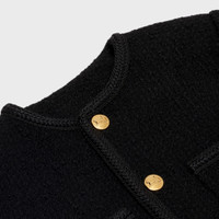 'CHASSEUR' JACKET WITH BRAID TRIM AND GOLD SULKY BUTTON IN BOUCLÉ TWEED DETAILS 58% VIRGIN WOOL, 35% MOHAIR, 7% POLYAMIDE 54% CUPRO, 46% VISCOSE LINING GALLOON TRIMS CLASSIC FIT CREW NECK TAILORED WITH SHOULDER PADS CHEST PATCH POCKETS 3 GOLD CELINE SULKY BUTTONS 4 GOLD CELINE SULKY BUTTONS ON THE CUFFS MADE IN ITALY REFERENCE : 2V00C764L.38NO