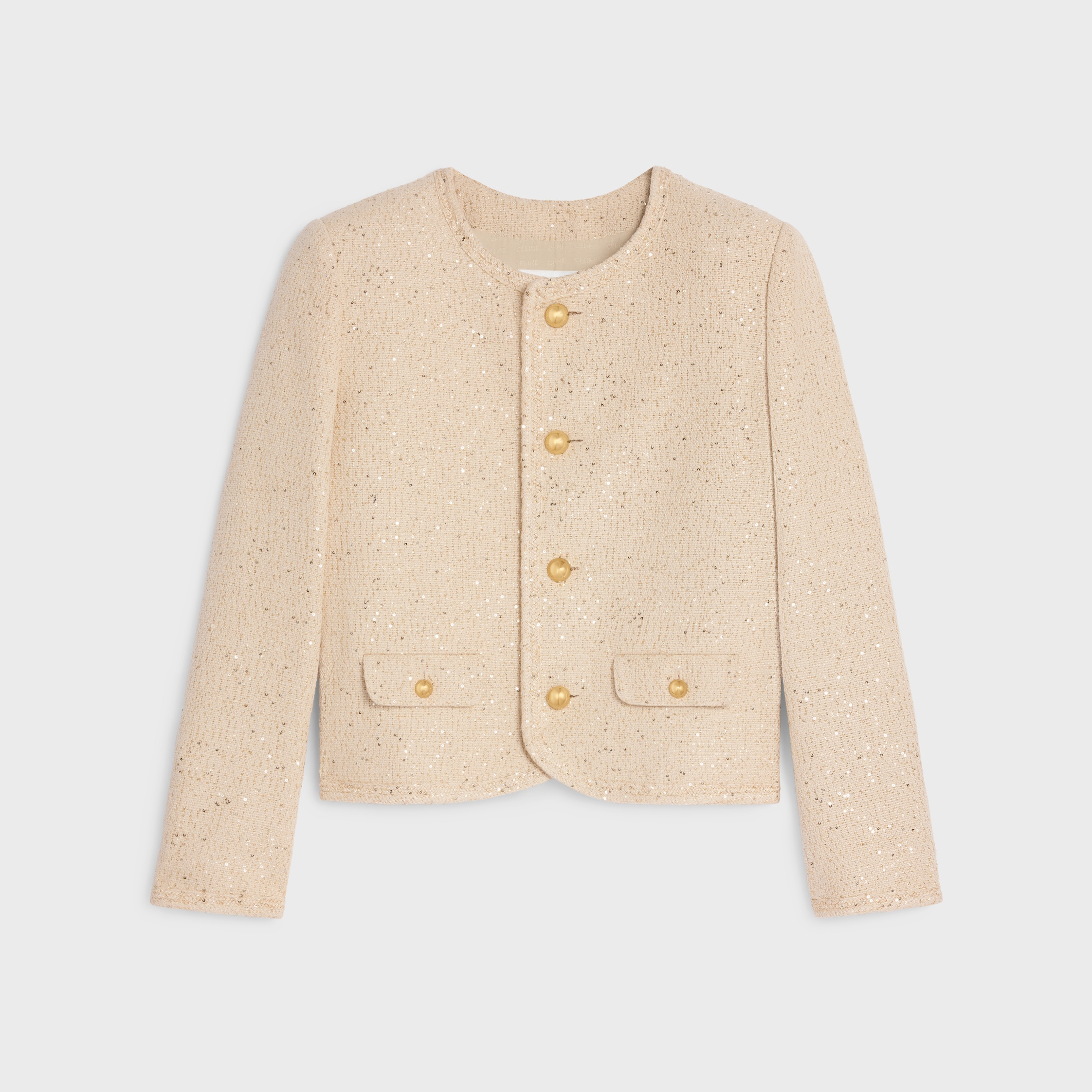 CHELSEA JACKET WITH BRAIDED PIPING IN SEQUIN SILK TWEED DETAILS 54% SILK 17% COTTON 15% POLYAMIDE 14% POLYESTER LINING 51% MODACRYLIC 49% VISCOSE CLASSIC FIT TAILORED WITH SHOULDER PADS CREW NECK 2 FLAP POCKETS BRAIDED PIPING DETAILS 4 CELINE PARIS-ENGRAVED HALF-SPHERE BUTTONS 1 CELINE PARIS-ENGRAVED HALF-SPHERE BUTTON ON THE POCKET 4 CELINE PARIS-ENGRAVED HALF-SPHERE BUTTONS ON THE CUFFS MADE IN ITALY REFERENCE: RV07T181Z.03AS