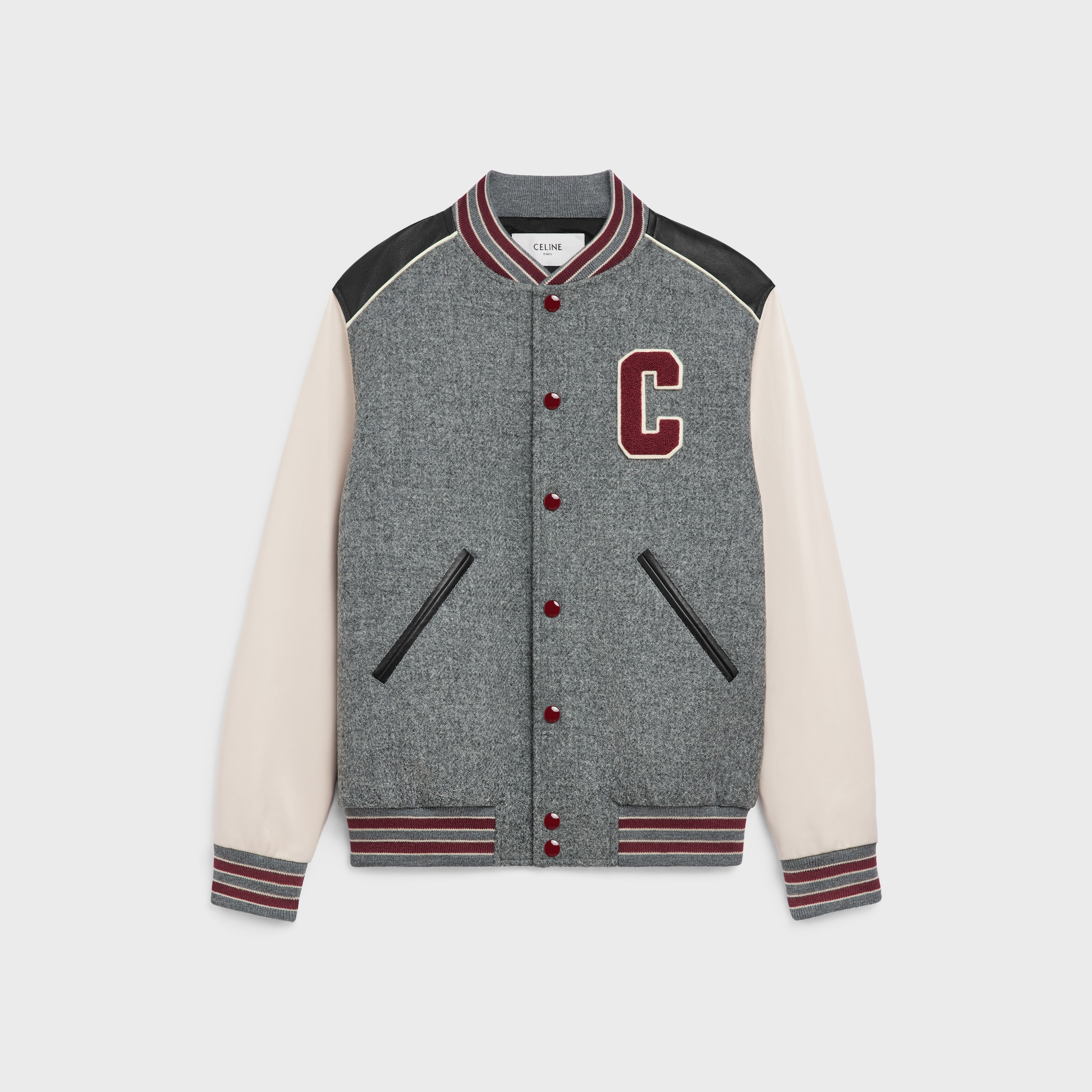 CLASSIC TEDDY JACKET WITH 'C' PATCH AND LEATHER DETAILS IN SHETLAND WOOL TRICOTINE DETAILS 100% WOOL LINING 100% VISCOSE LEATHER PART 100% LAMBSKIN 'C' PATCH ON THE CHEST AND BACK CLASSIC FIT TWO-TONE TEDDY COLLAR 2 DIAGONAL WELT POCKETS IN CONTRASTING LEATHER SHOULDERS AND SLEEVES IN CONTRASTING LEATHER TWO-TONE RIBBED TRIM 7 CONTRASTING CELINE-ENGRAVED SNAP BUTTONS MADE IN ITALY REFERENCE : 2V56DA335.09GD