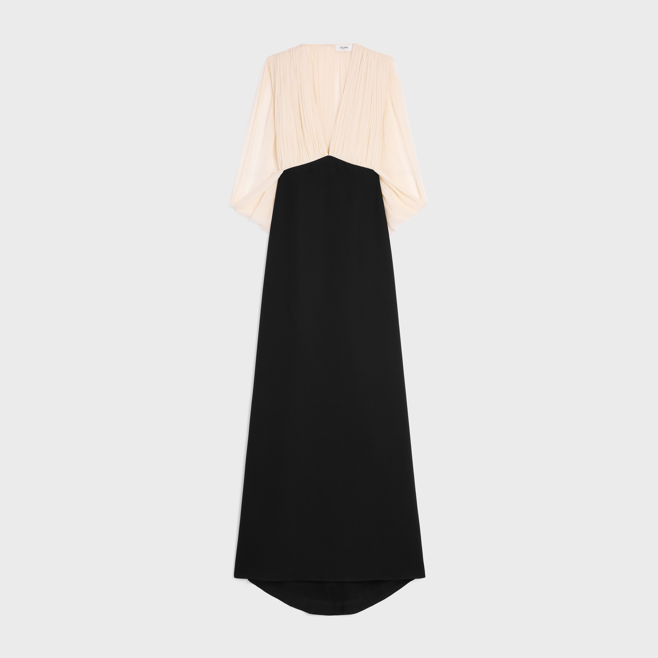 DETAILS 100% SILK SECOND MATERIAL 100% POLYAMIDE CLASSIC FIT MAXI LENGTH V NECK MIDDLE BACK ZIP AND HOOK-AND-EYE CLOSURE MADE IN FRANCE REFERENCE : RR0FW327N.01AV