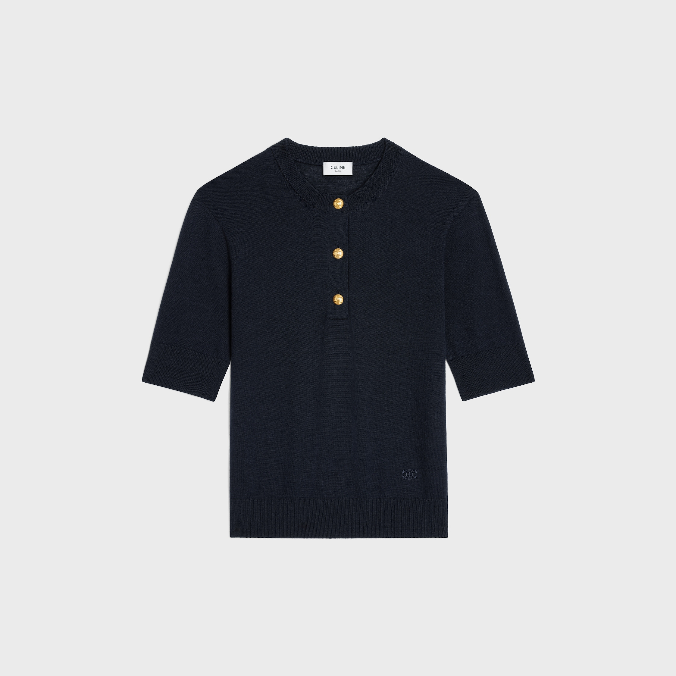 DETAILS 100% WOOL TRIOMPHE EMBROIDERY CLASSIC FIT CREW NECK SHORT SLEEVES RIBBED TRIM 3 TRIOMPHE BUTTONS MADE IN ITALY REFERENCE : RY0CED068.07MR