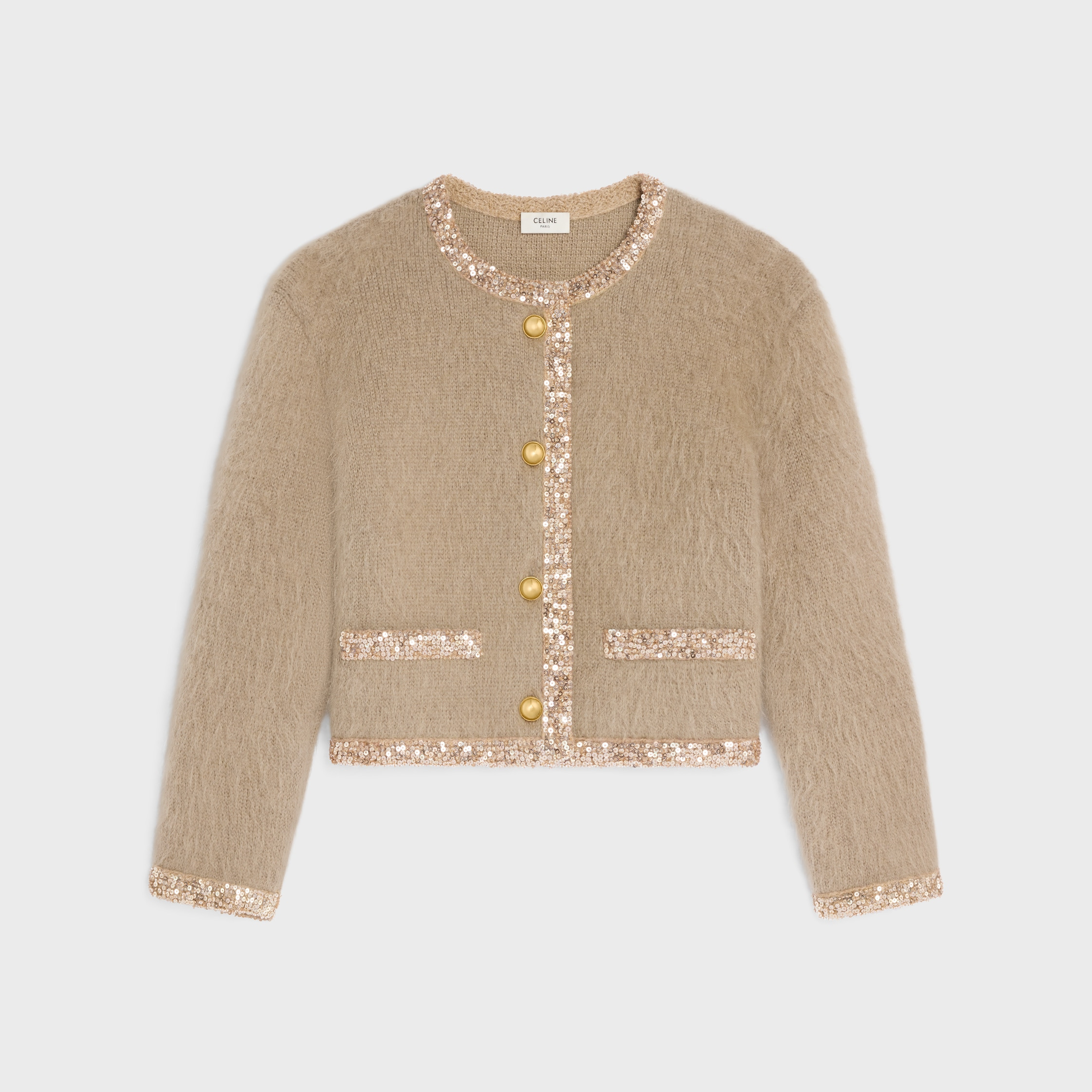 CARDIGAN JACKET WITH SEQUIN EMBROIDERY IN BRUSHED MOHAIR DETAILS SEQUIN EMBROIDERY ON THE BRAIDED PIPING CLASSIC FIT CREW NECK 2 WELT POCKETS BRAIDED PIPING DETAILS 4 GOLD BUTTONS REFERENCE: RV0JV440U.18TP