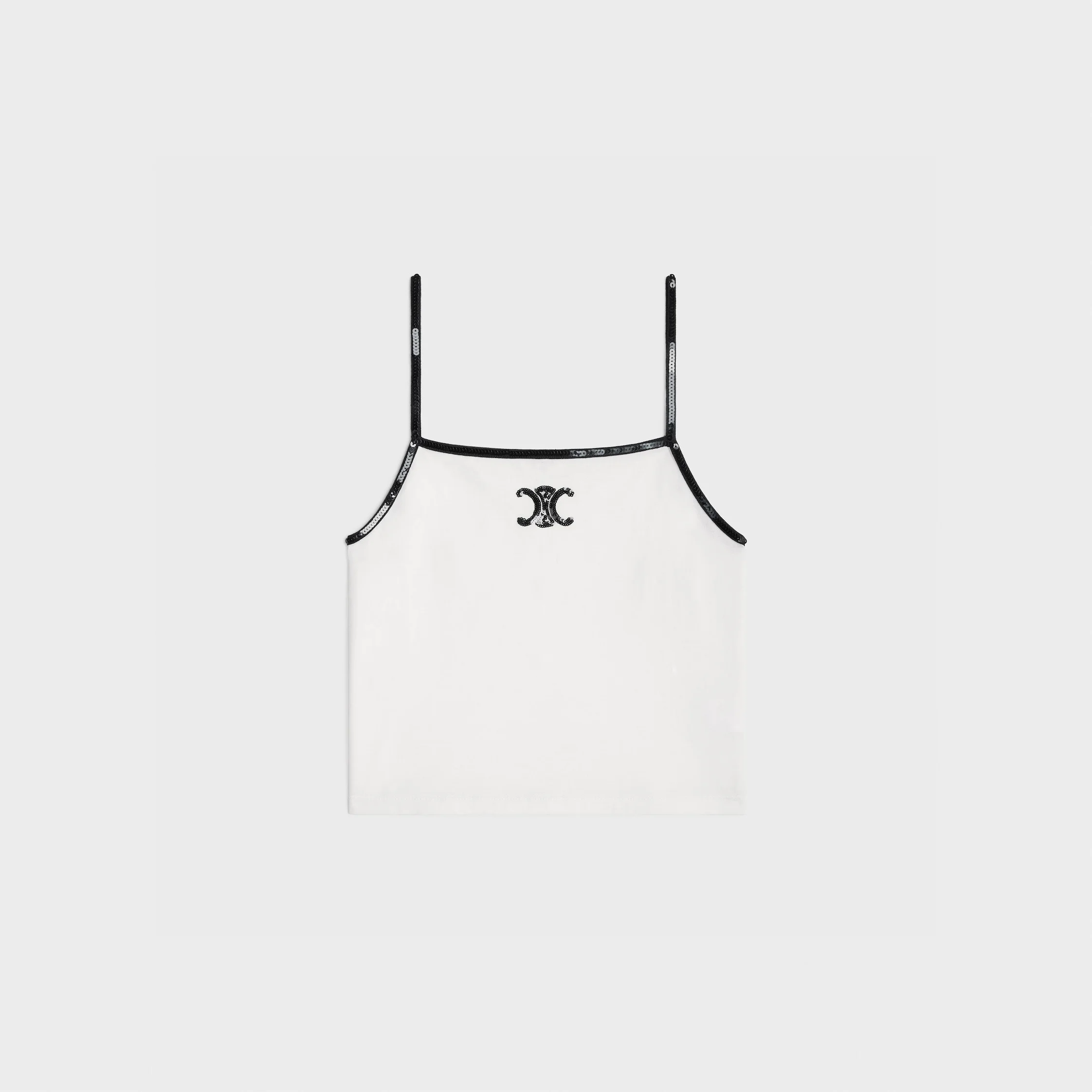CROPPED TANK TOP WITH TRIOMPHE SEQUIN EMBROIDERY IN COTTON JERSEY DETAILS 100% COTTON TRIOMPHE SEQUIN EMBROIDERY SEQUIN EMBROIDERY ON THE SHOULDER STRAPS AND NECKLINE CLASSIC FIT CROPPED LENGTH MADE IN ITALY REFERENCE : 2X53F671Q.01OB
