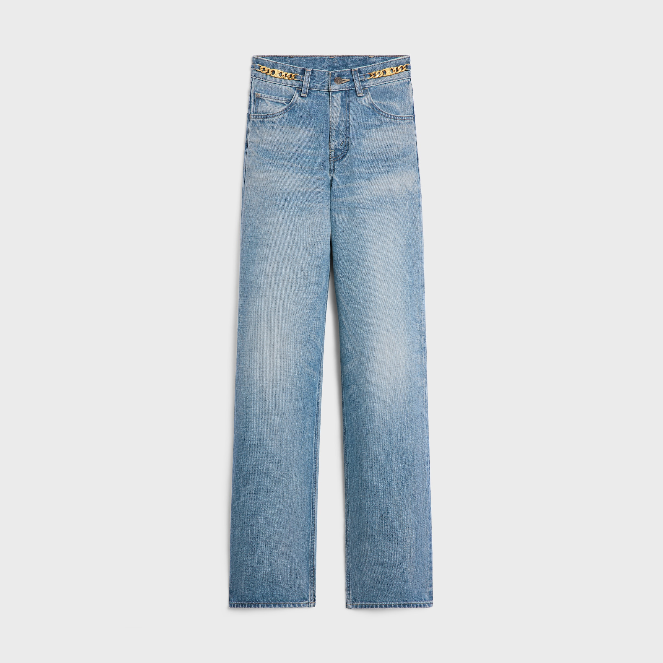 HIGH-WAISTED KITTY JEANS WITH GOURMETTE CHAINS IN PISMO WASH DENIM DETAILS 100% COTTON PISMO WASH TRIOMPHE GOURMETTE CHAINS AT THE WAIST CLASSIC FIT HIGH-WAISTED STRAIGHT LEG 5 POCKETS RIVETS ON THE FRONT POCKETS PATCH AT THE BACK ON THE WAISTBAND CELINE JEANS-ENGRAVED ZIP AND BUTTONS MADE IN JAPAN REFERENCE : 2N923206T.08PI