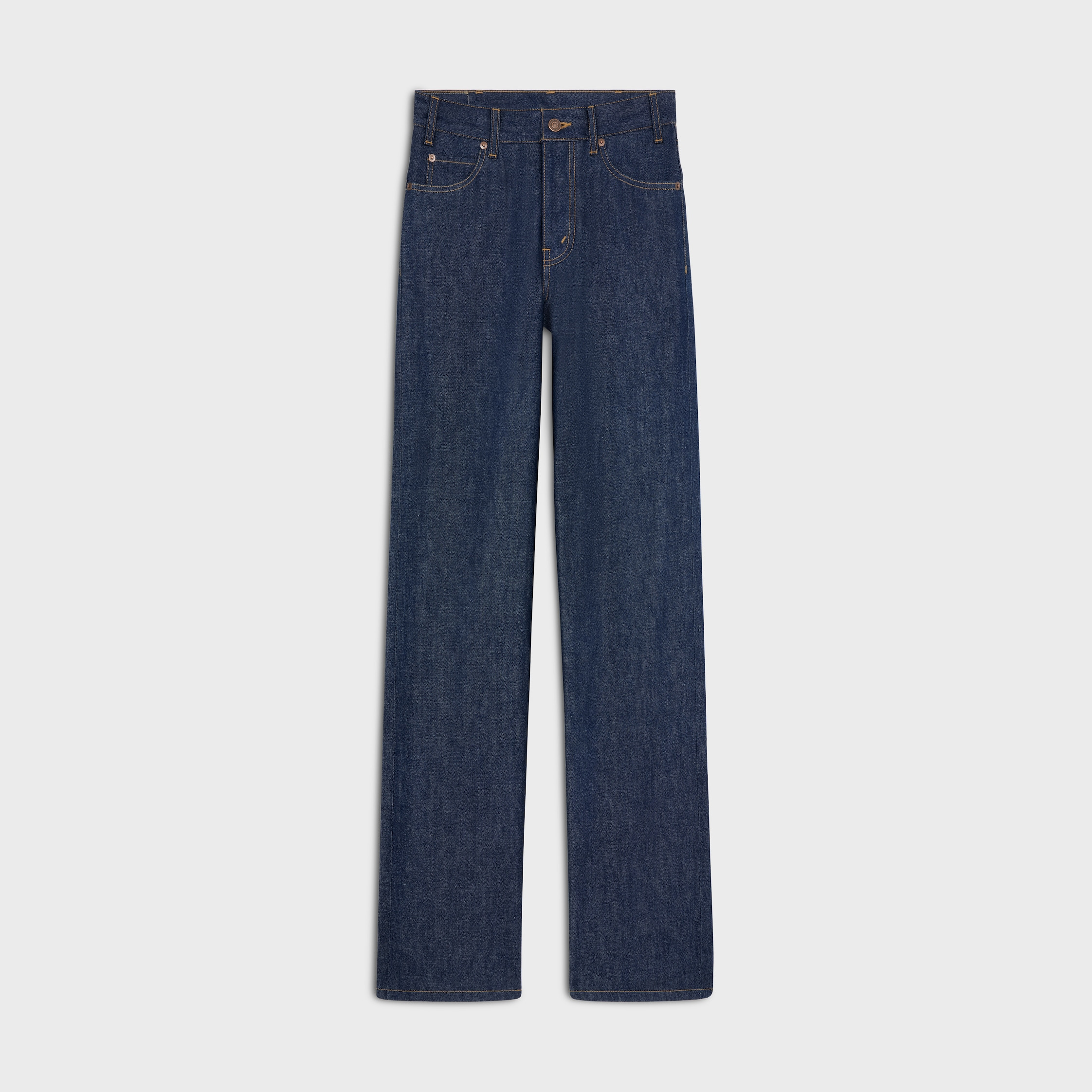 HIGH-WAISTED KITTY JEANS IN RAW WASH DENIMFITS TRUE TO SIZE. DETAILS 100% COTTON RAW WASH CLASSIC FIT HIGH-WAISTED STRAIGHT LEG 5 POCKETS RIVETS ON THE FRONT POCKETS PATCH AT THE BACK ON THE WAISTBAND CELINE JEANS-ENGRAVED ZIP AND BUTTON MADE IN JAPAN REFERENCE: 2N756558Z.07IA