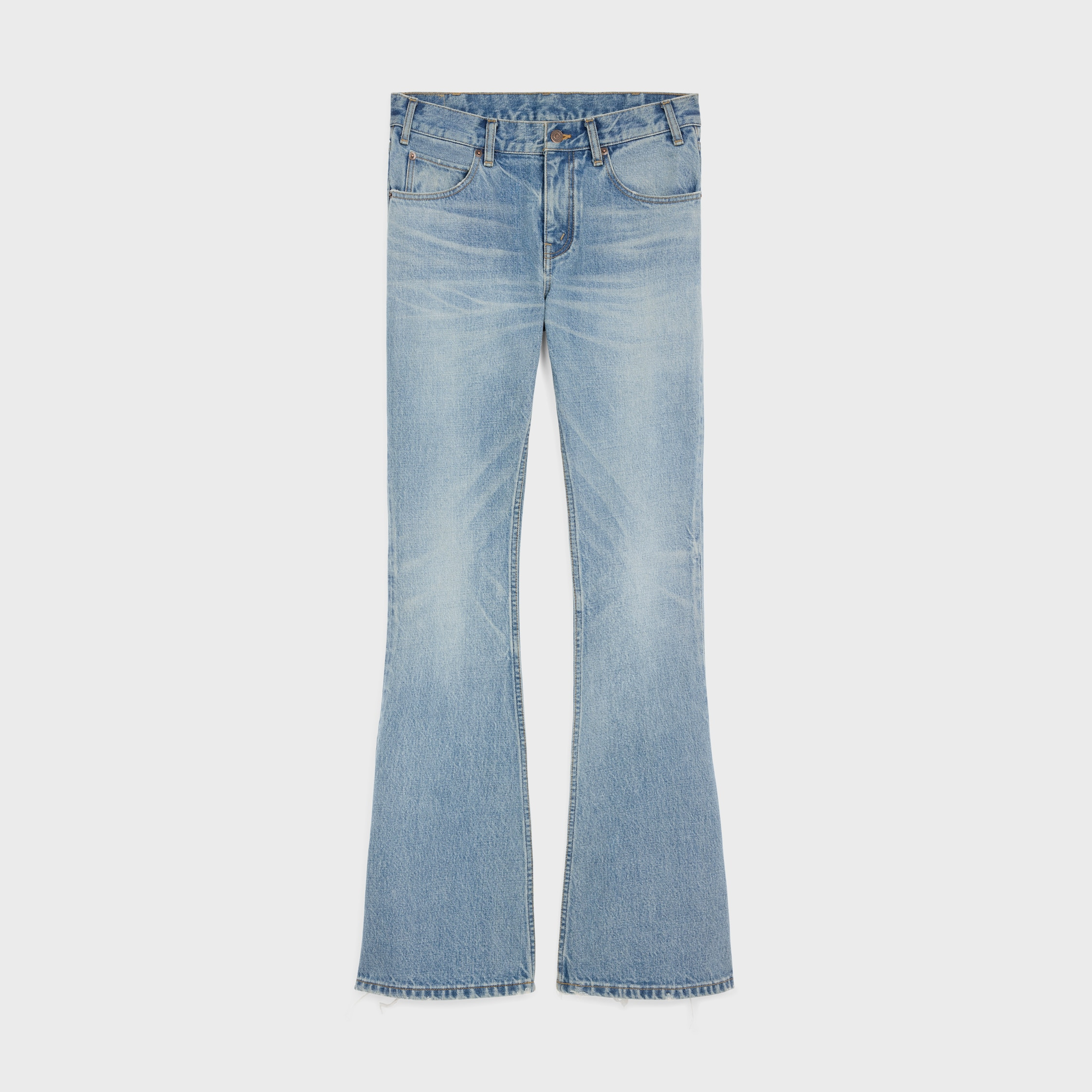 MARCO LOW-RISE JEANS IN STEEL BLUE WASH DENIMADJUSTED FIT.AUTHENTIC DENIM.SIZE UP FOR A MORE RELAXED FIT. DETAILS 100% COTTON STEEL BLUE WASH CLASSIC FIT LOW-RISE FLARED LEG 5 POCKETS RIVETS ON THE FRONT POCKETS PATCH AT THE BACK ON THE WAISTBAND CELINE JEANS-ENGRAVED ZIP AND BUTTON MADE IN JAPAN REFERENCE: 2N06B930F.07SV