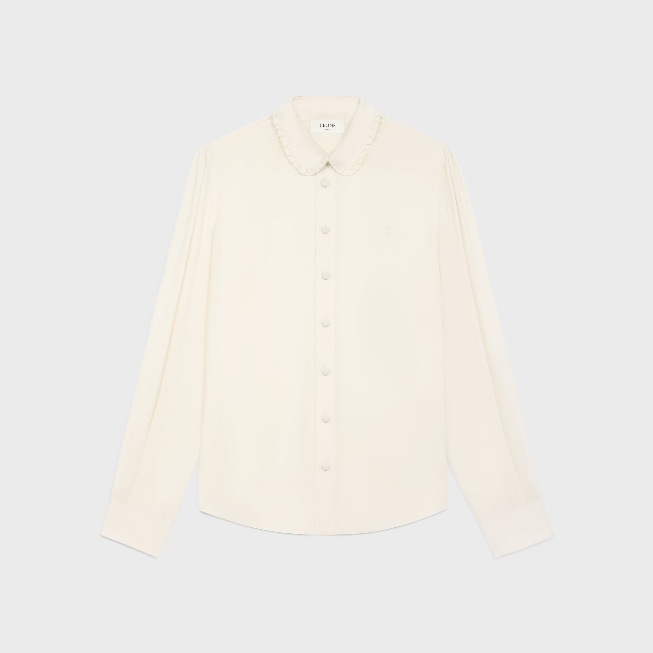 DETAILS 69% ACETATE 31% SILK TRIOMPHE EMBROIDERY CLASSIC FIT DRUGSTORE COLLAR WITH FRILLS BUTTONED CUFFS 8 COVERED BUTTONS 1 COVERED BUTTON ON THE CUFFS ROUNDED HEM MADE IN PORTUGAL REFERENCE : RC02D008D.01AV