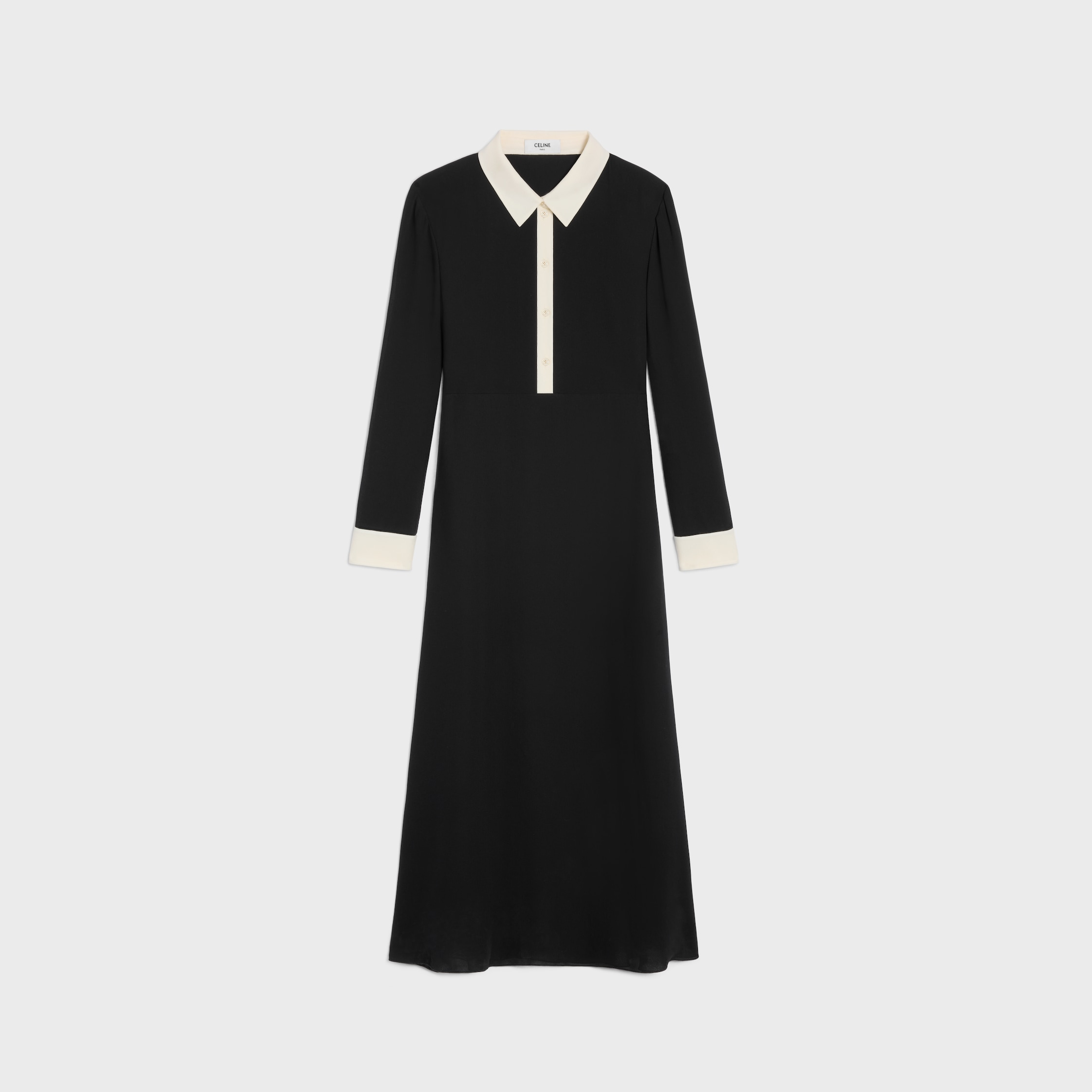 DETAILS 100% VISCOSE CLASSIC FIT MIDI LENGTH CONTRASTING SHIRT COLLAR CONTRASTING BUTTONED CUFFS 5 TRIOMPHE BUTTONS 1 TRIOMPHE BUTTON ON THE CUFFS SIDE ZIP MADE IN ITALY REFERENCE : RR0BY243G.38NO