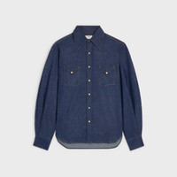 DETAILS 100% COTTON CLASSIC FIT DRUGSTORE COLLAR 2 PATCH POCKETS WITH FLAP ON THE CHEST ROUNDED HEM 6 TRIOMPHE SNAP BUTTONS 1 CELINE PARIS-ENGRAVED BUTTON ON THE COLLAR 1 TRIOMPHE SNAP BUTTON ON THE POCKETS 3 TRIOMPHE SNAP BUTTONS ON THE CUFFS MADE IN JAPAN REFERENCE : RC0AD2N67.GGG3