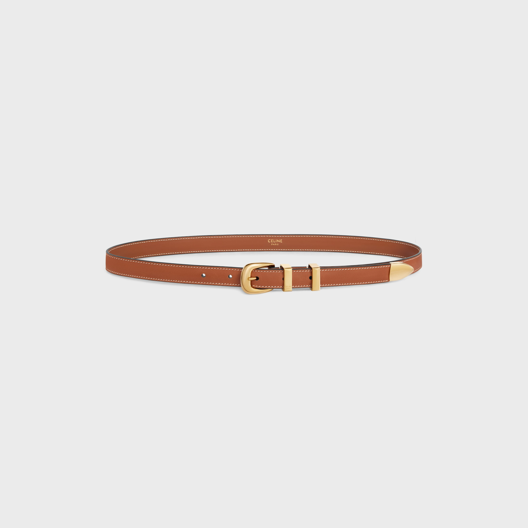 DETAILS CALFSKIN MIDDLE-WAIST GOLD FINISHING WIDTH : 0.7 IN (1.8 CM) WESTERN BUCKLE TWO METAL LOOPS AND ONE METAL TIP. CELINE PARIS LOGO ENGRAVED ON THE BOTTOM OF THE FIRST LOOP. REFERENCE : 45BAE3A78.04LU