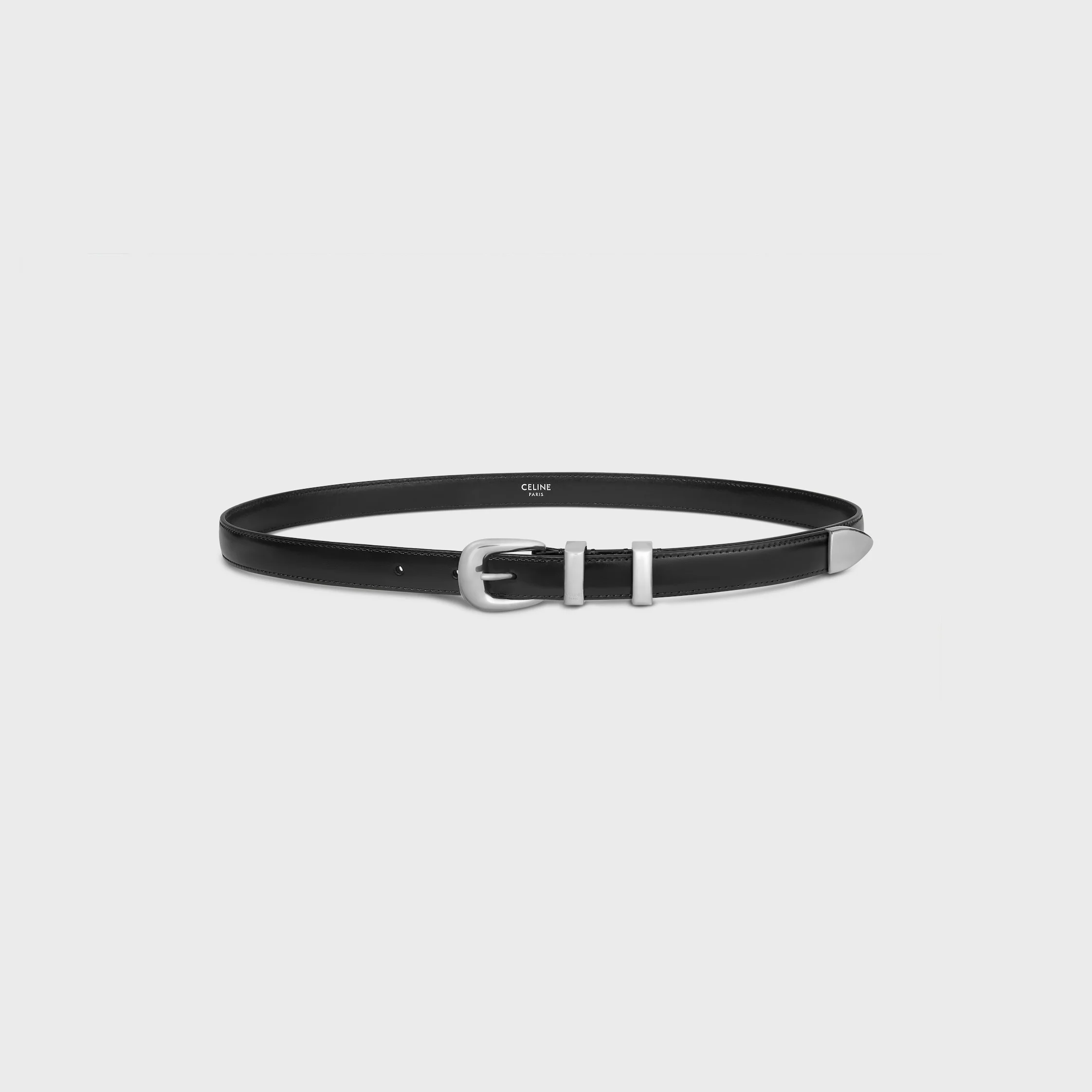DETAILS TAURILLON MIDDLE-WAIST SILVER FINISHING WIDTH : 0.7 IN (1.8 CM) WESTERN BUCKLE TWO METAL LOOPS AND ONE METAL TIP. CELINE PARIS LOGO ENGRAVED ON THE BOTTOM OF THE FIRST LOOP. REFERENCE : 45BAE3A01.38SI