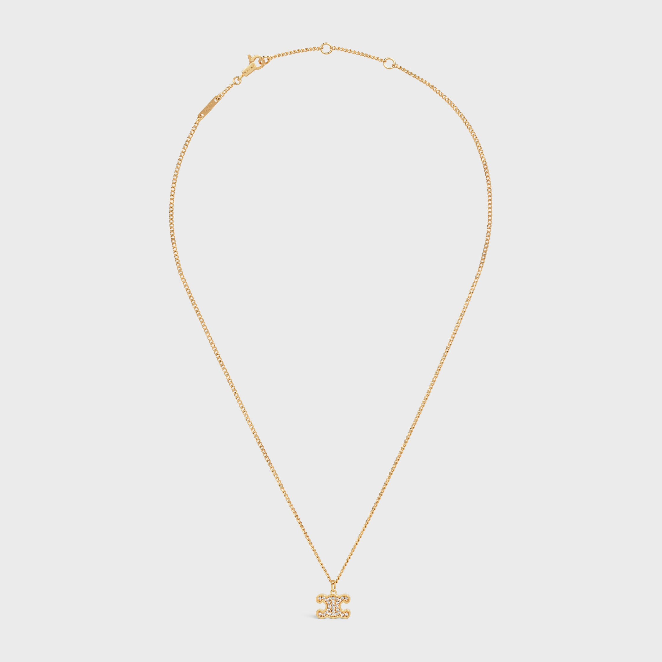DETAILS TOTAL LENGTH 17 IN (42 CM) ADJUSTABLE TO 15.7 IN (40 CM) ADDITIONAL ADJUSTEMENT RING AT 15 IN (38 CM) TRIOMPHE DIMENSIONS: 0.4 X 0.3 IN (1 X 0.8 CM ) BRASS AND CRYSTALS NICKEL FREE CELINE PARIS SIGNATURE ENGRAVED SNAP HOOK REFERENCE : 460GB6BZI.35OR