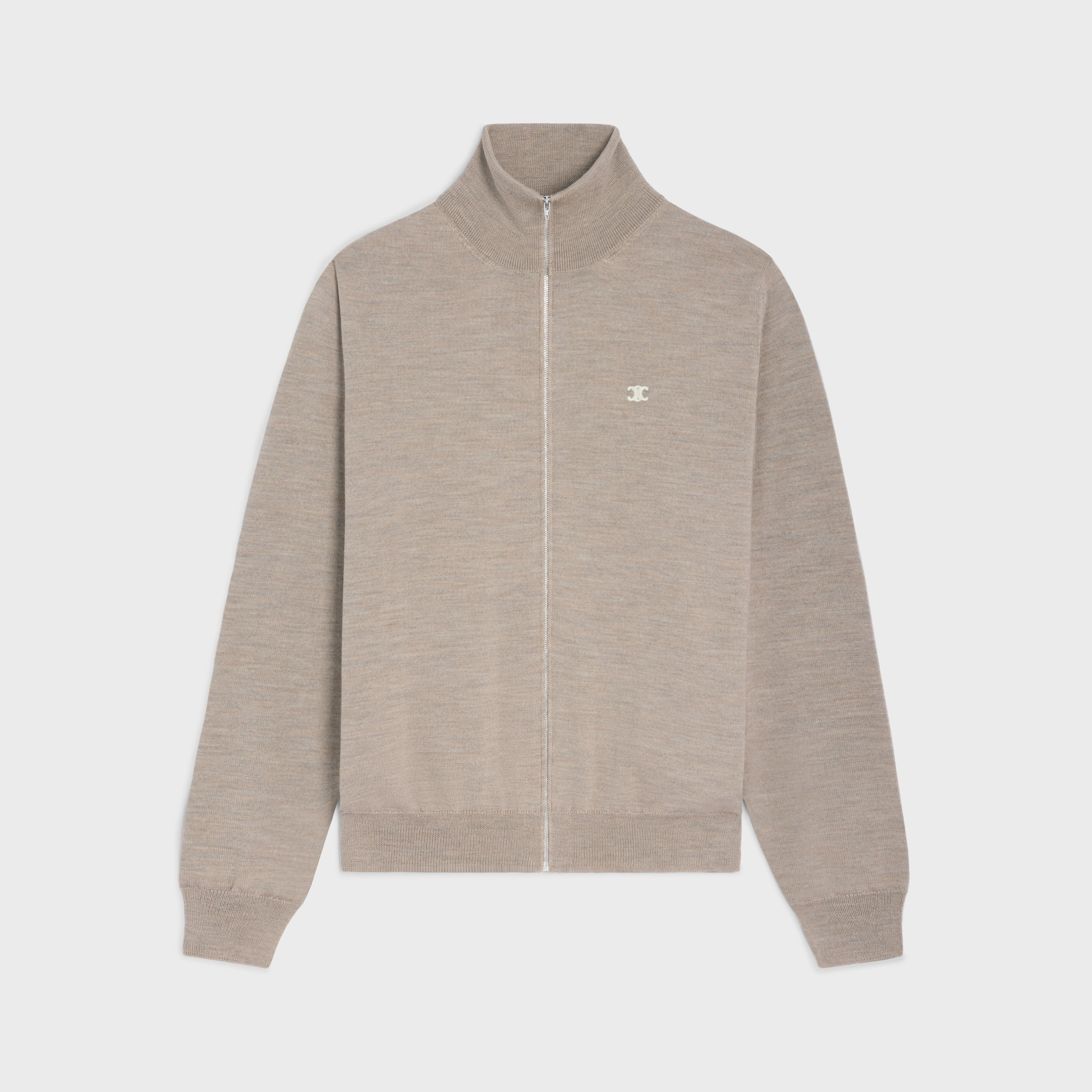 DETAILS 100% WOOL TRIOMPHE EMBROIDERY CLASSIC FIT HIGH COLLAR LONG SLEEVES RIBBED TRIM ZIP CLOSURE MADE IN ITALY