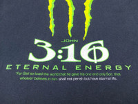 Vintage Jesus Eternal Energy John 3:16 Christian Official Licensed Short Sleeve Black T-Shirt The product images shown are taken from the actual item - CONDITION - Used - Good Minor flaws or signs of wear, to be noted in the description and photos - FLAWS - Fade (Flaws In Last Picture) - Size.L - Measures the actual Size L - SIZE SPECIFICATIONS - Approximate Measurements Pit to Pit 22 inches Length 29.5 inches Shoulders 21.5 inches Sleeve Lenght 7.5 inches Hem 23 inches - DETAILS - Tag : Delta Made In Honduras Material : 100% Cotton Double-Stitch Tubular (Without Side-Seamed) Release Date : Early 2000's - SHIPPING - Buyers from the United States It usually takes 7-14 days for the product to reach you - PLEASE NOTE - * Differences in color should be acceptable due to the light and screen ** Please make sure you check the measurements yourself before purchase If you have any other questions please feel free to ask me Chady Shop No.E172100