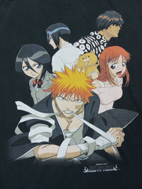 Vintage Y2K Bleach Shonen Jump Main Characters ichigo Double-Sided Official Licensed Short Sleeve Black T-Shirt Very Rare To Find It Is Vintage This is not new reprints - CONDITION - Used - Good Minor flaws or signs of wear, to be noted in the description and photos - FLAWS - Graphic Little Cracking (Flaws In Last Picture) - Size.L - Tag states Size L label Measures the actual Size M/L - SIZE SPECIFICATIONS - Approximate Measurements Pit to Pit 21.5 inches Length 26 inches Shoulders 18.5 inches Sleeve Lenght 7.5 inches Hem 22.5 inches - DETAILS - Tag : Bleach Shonen Jump Made In India Material : 100% Cotton Double-Stitch Side-Seamed Release Date : 2006 - SHIPPING - Buyers from the United States It usually takes 7-14 days for the product to reach you - PLEASE NOTE - * Differences in color should be acceptable due to the light and screen ** Please make sure you check the measurements yourself before purchase If you have any other questions please feel free to ask me Chady Shop No.SA86550