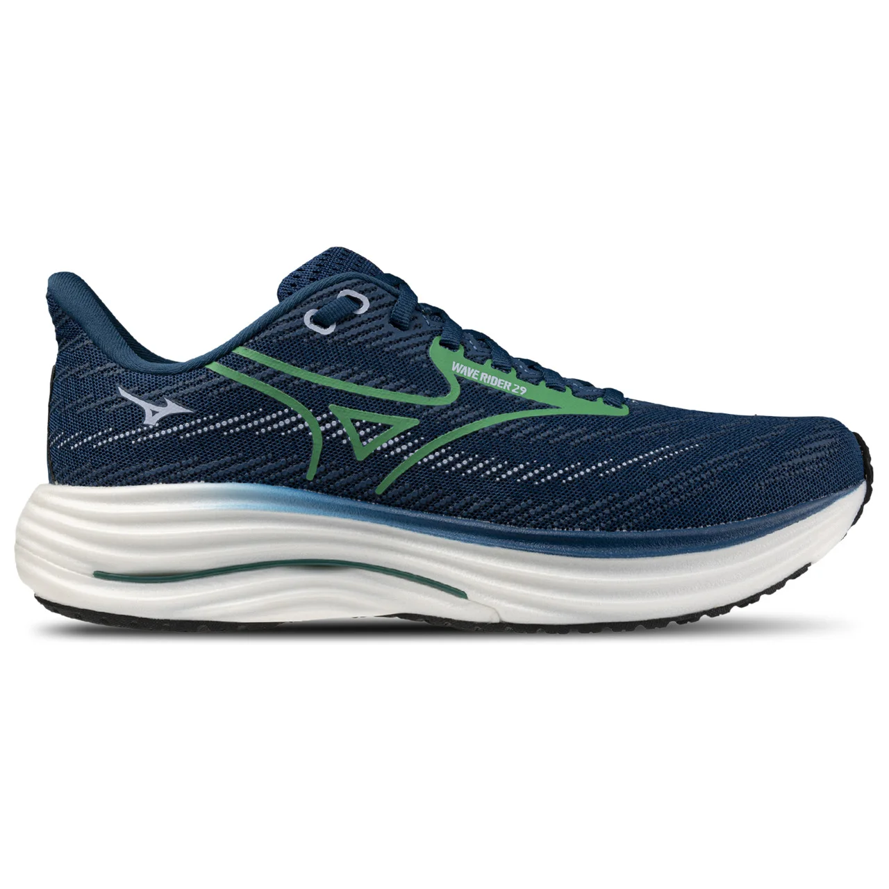 Embrace the feeling of effortless stride with the Mizuno Wave Rider 29. Perfect for your next marathon, these versatile shoes feature the Mizuno Wave plate, which disperses energy from impact into a broader area to provide stability and cushioning. Designed to maximize energy return, these shoes enhance your efficiency and keep you moving with the next generation of Mizuno Enerzy midsole material. The legendary MIZUNO WAVE structure delivers a ride that feels both familiar and revolutionary, while eco-friendly recycled materials prove that peak performance and planet-friendly choices can stride side by side. Durable and supportive, the Mizuno Wave Rider 29 makes sure you're always ready to go the extra mile. Mizuno Wave Rider 29 features: Jacquard mesh upper provides breathability. Innovative gusseted tongue hugs the foot securely and comfortably. Strategic placement of carbon rubber maximizes durability in high-wear areas and enhances responsiveness. X10 outsole with carbon rubber delivers durability. Heel-to-toe drop: 10 mm. Weight: 8 oz.