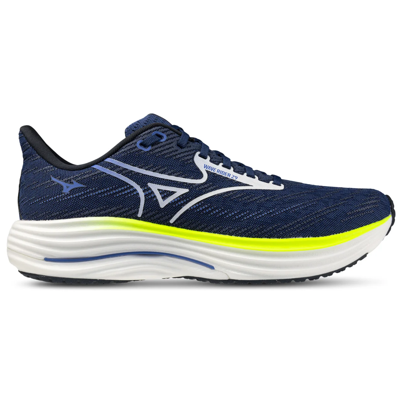 Embrace the feeling of effortless stride with the Mizuno Wave Rider 29. Perfect for your next marathon, these versatile shoes feature the Mizuno Wave plate, which disperses energy from impact into a broader area to provide stability and cushioning. Designed to maximize energy return, these shoes enhance your efficiency and keep you moving with the next generation of Mizuno Enerzy midsole material. The legendary MIZUNO WAVE structure delivers a ride that feels both familiar and revolutionary, while eco-friendly recycled materials prove that peak performance and planet-friendly choices can stride side by side. Durable and supportive, the Mizuno Wave Rider 29 makes sure you're always ready to go the extra mile. Mizuno Wave Rider 29 features: Jacquard mesh upper provides breathability. Innovative gusseted tongue hugs the foot securely and comfortably. Strategic placement of carbon rubber maximizes durability in high-wear areas and enhances responsiveness. X10 outsole with carbon rubber delivers durability. Heel-to-toe drop: 10 mm. Weight: 8 oz.