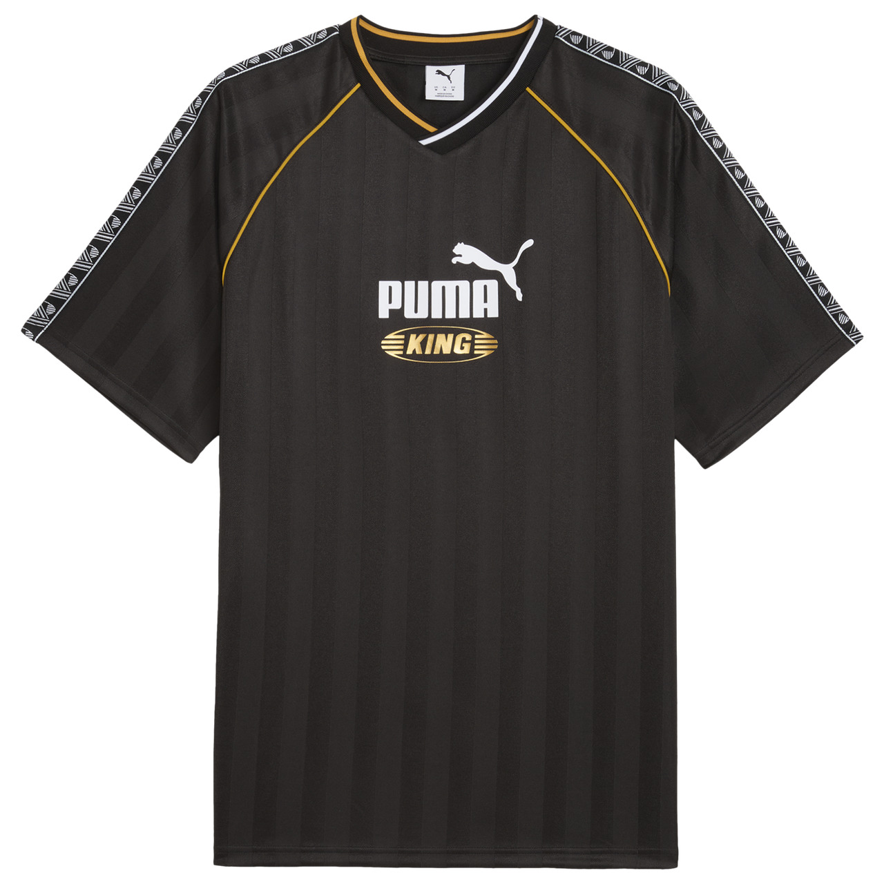 Some legends never fade; they evolve. Step into legacy with the PUMA King Jersey. Inspired by the legendary King Indoor that defined early 2000s street style, this jersey brings that same iconic energy into today's game. Part of a bold, archive-inspired collection designed to inspire the next generation, the King logo takes pride of place front and center, delivering a signature look that commands attention. Crafted from breathable pique fabric and enhanced with dryCELL technology, this jersey keeps you cool and sweat-free whether you're on the pitch or off-duty. The graphic tape on the sleeves gives you that laid-back edge, while the bold all-over print ensures you stand out with every move. From kick-off to kick-back, the PUMA King Jersey is your go-to for style, comfort, and legacy-level confidence. PUMA King Jersey features: Relaxed fit delivers a comfortable feel. Short sleeves allow ventilation. V-neck offers a flattering look. Regular length gives a clean finish. Shell: 100% polyester; Rib: 97% polyester/3% elastane. Imported.