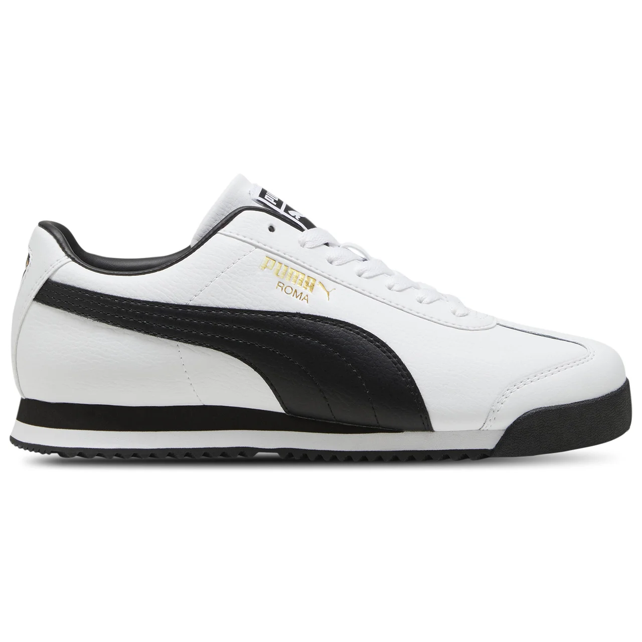 Step into the PUMA Roma for premium comfort and style. The traditional lace-up design and padded tongue give you a secure fit, while the footbed provides cushioning for your whole day. Scuff-resistant rubber forms the toe bumper, and PUMA branding completes the sweet, athletic look. Lightly padded collar provides a snug, comfortable fit. Woven PUMA label is featured on the tongue. Gold or silver foil detailing appears on the side. Two-tone EVA midsole gives you excellent cushioning and shock absorption. Rubber outsole offers durable traction.