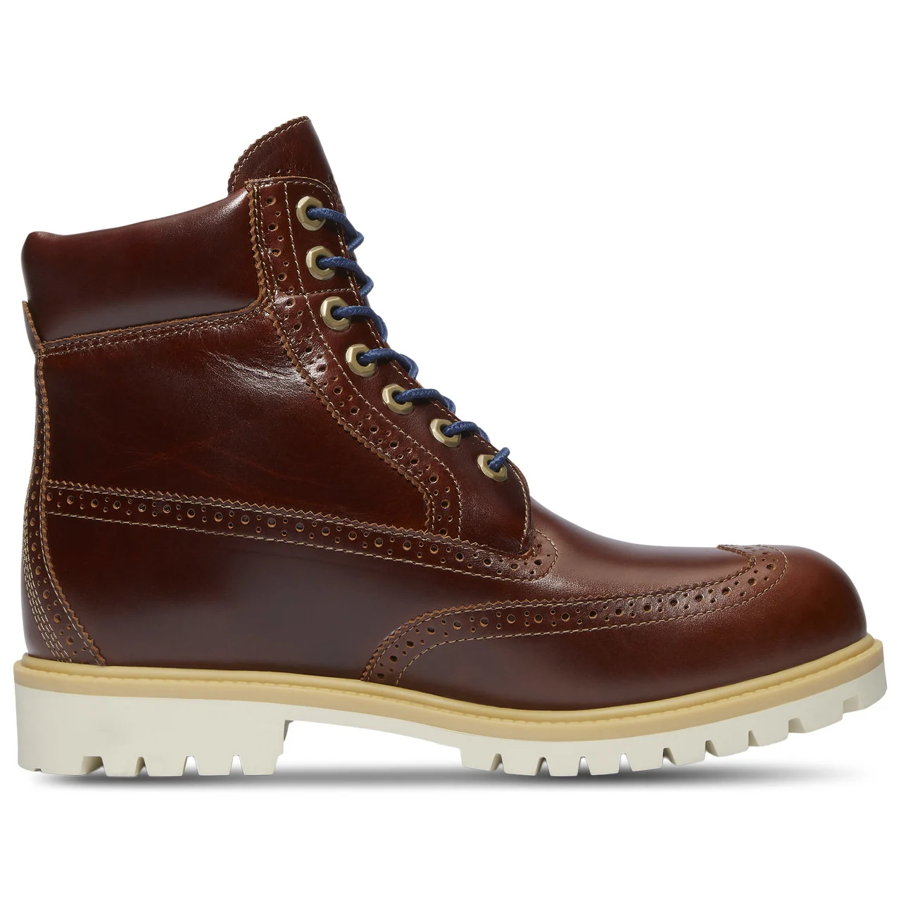 The Timberland 6 Inch Brogue Boots combine timeless style with sustainable features for all-day comfort and durability. Built to keep your feet dry and warm, these boots feature 400 g of PrimaLoft insulation that's perfect for chilly days. The ReBOTL fabric lining, containing at least 50% recycled plastic, helps reduce waste while providing breathability. The laces are crafted from 100% recycled PET, with an extra pair included (just in case your adventure demands it). The anti-fatigue removable footbed cushions every step, giving you the kind of support that keeps you moving from dawn till dusk without the aches. Striking a perfect balance between rugged functionality and sustainability, the Timberland 6 Inch Brogue Boots keep you comfortable, protected, and walking a little lighter on the planet. Timberland 6 Inch Brogue Boots features: Upper made with Premium Timberland Leather offers sustainable comfort. Lace-up style provides a secure fit. Padded leather collar enhances comfort. Steel shank adds arch support. Seam-sealed construction ensures durability. Rubber lug outsole delivers grip and traction.