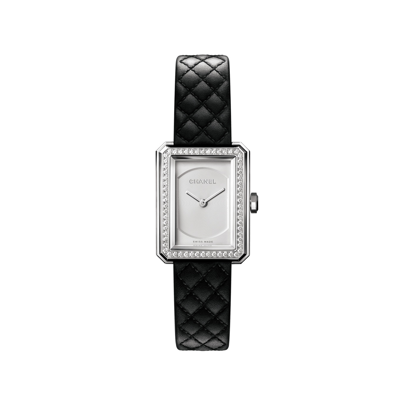 BOY·FRIEND Watch, Small version, steel and diamonds, quilted pattern calfskin strap on the CHANEL website. Small version, steel and diamonds, quilted pattern calfskin strap