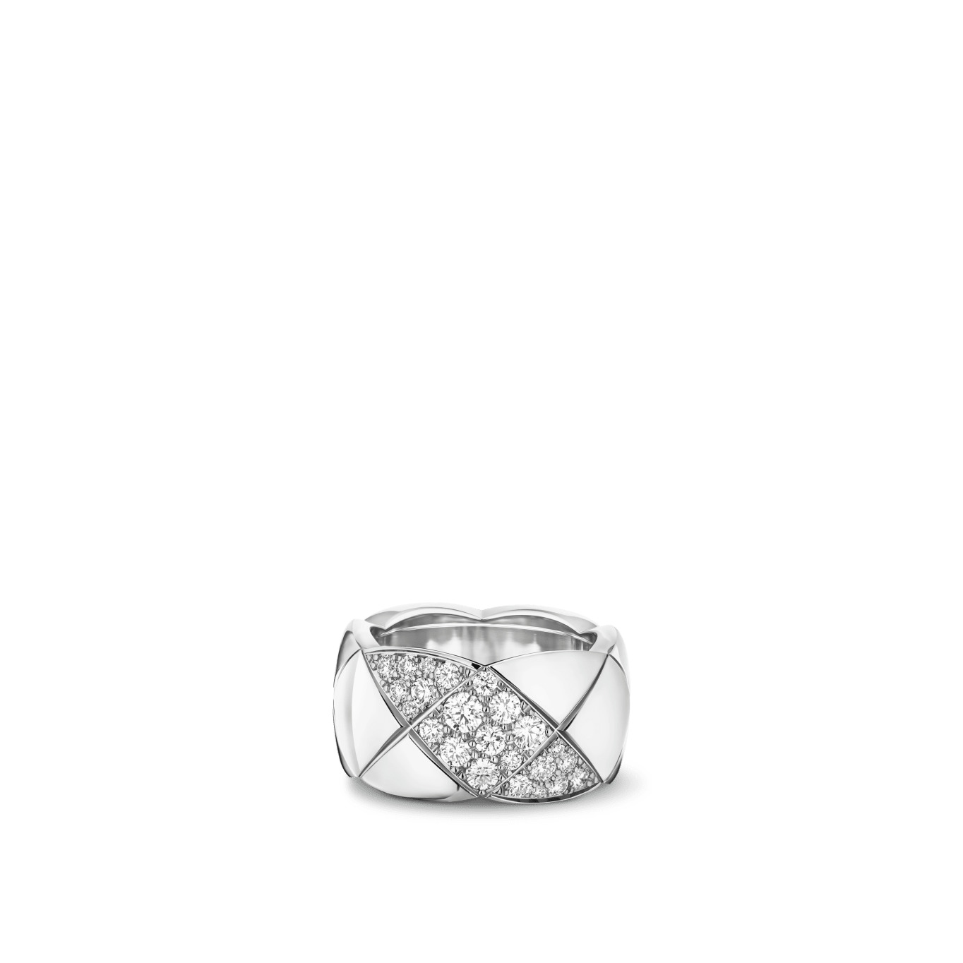 Coco Crush ring, Quilted motif, large version, 18K white gold, diamonds on the CHANEL website. Quilted motif, large version, 18K white gold, diamonds