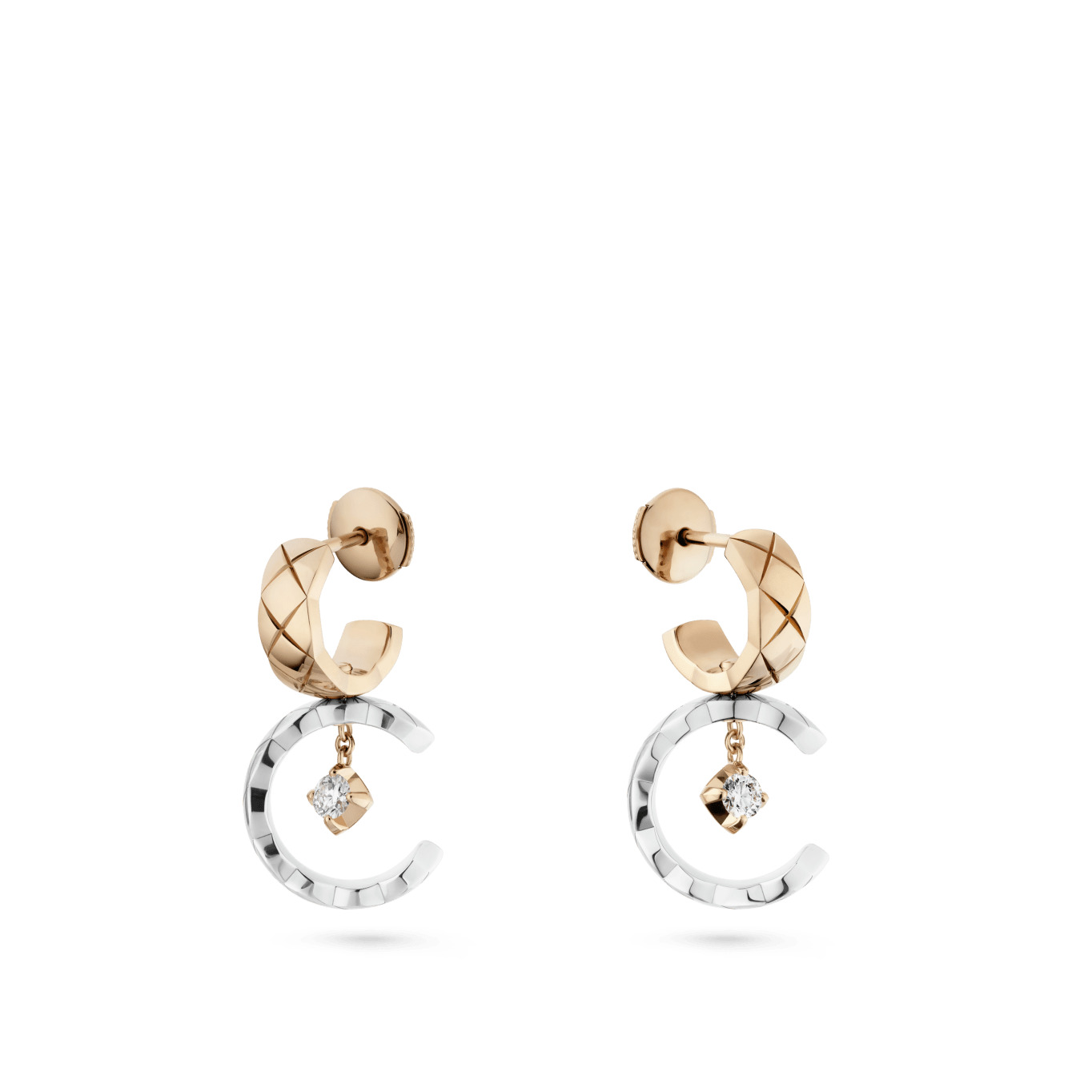 COCO earrings, Quilted motif, 18K white and BEIGE GOLD, diamonds on the CHANEL website. Quilted motif, 18K white and BEIGE GOLD, diamonds
