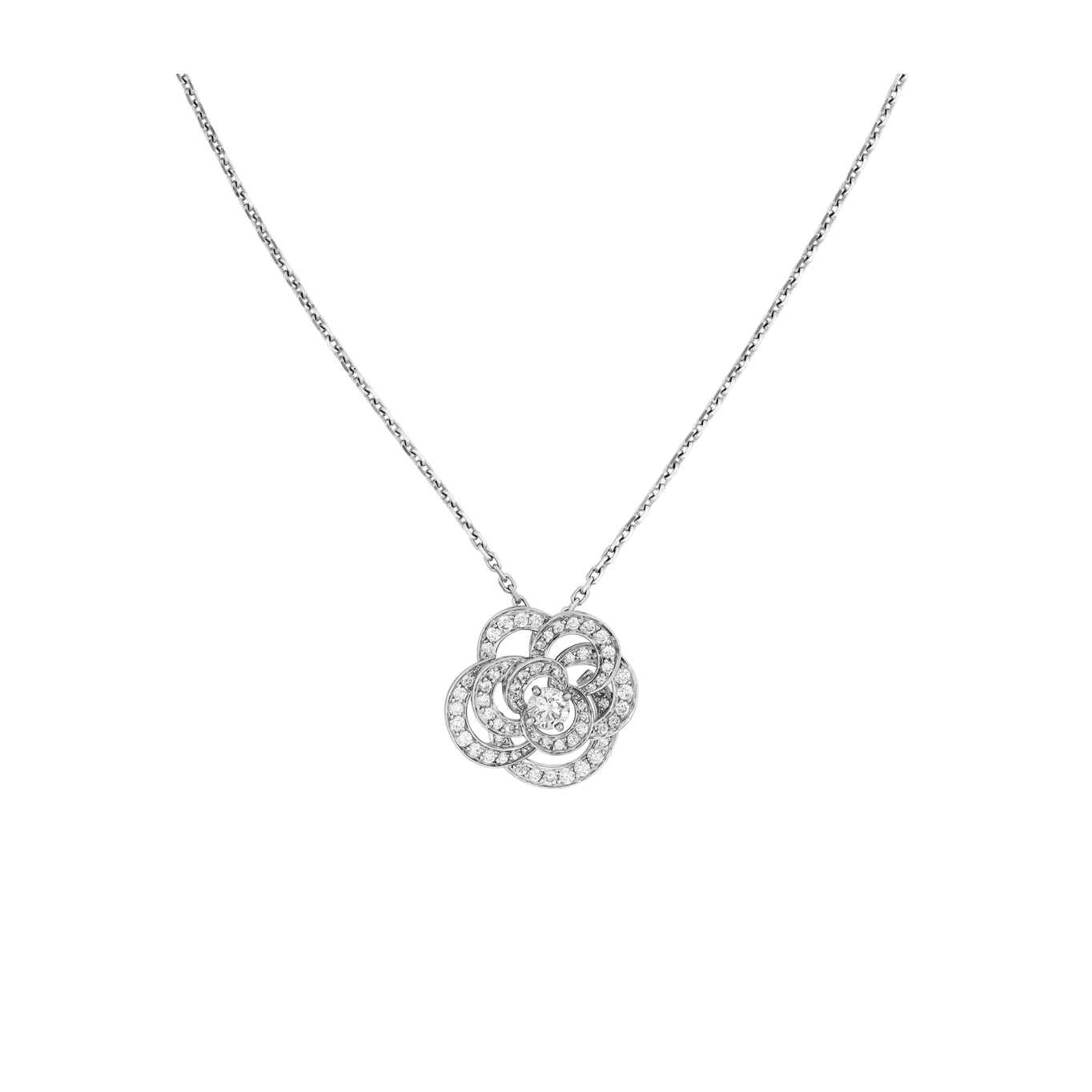 Fil de Camélia necklace, Large version, 18K white gold, diamonds on the CHANEL website. Large version, 18K white gold, diamonds