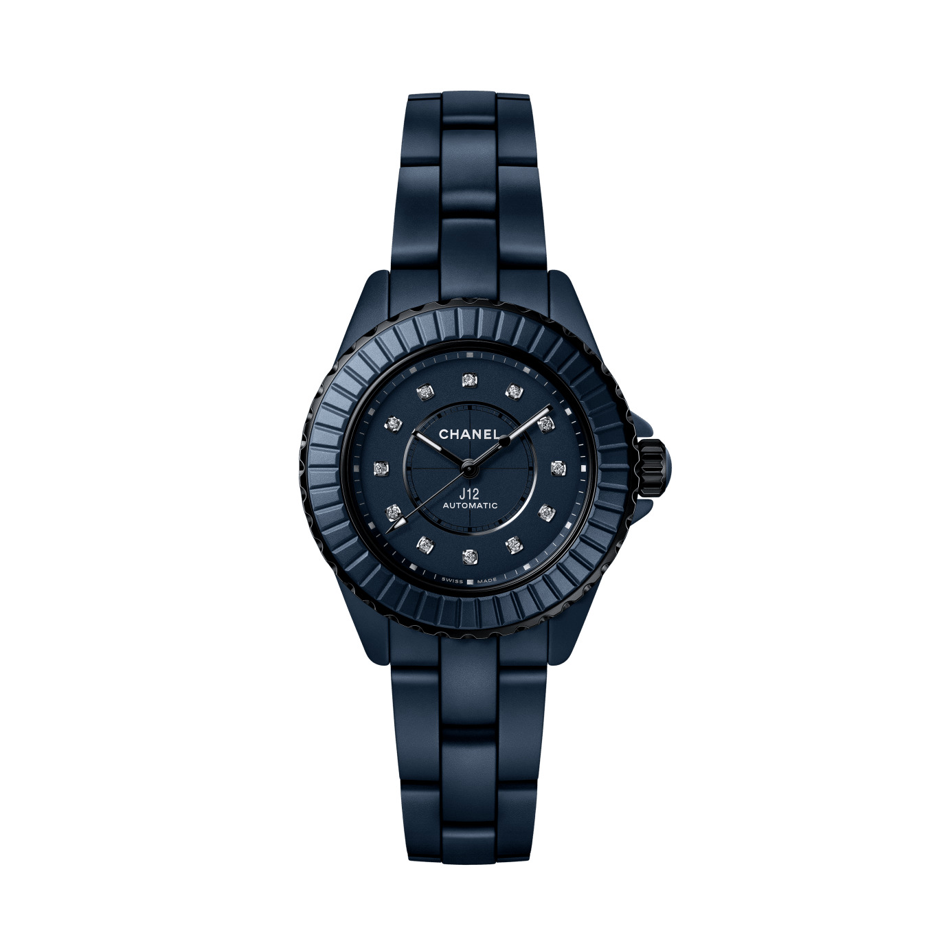 J12 BLEU Watch Caliber 12.2, 33 MM, Matte blue highly resistant ceramic and steel, diamond indicators on the CHANEL website. Matte blue highly resistant ceramic and steel, diamond indicators