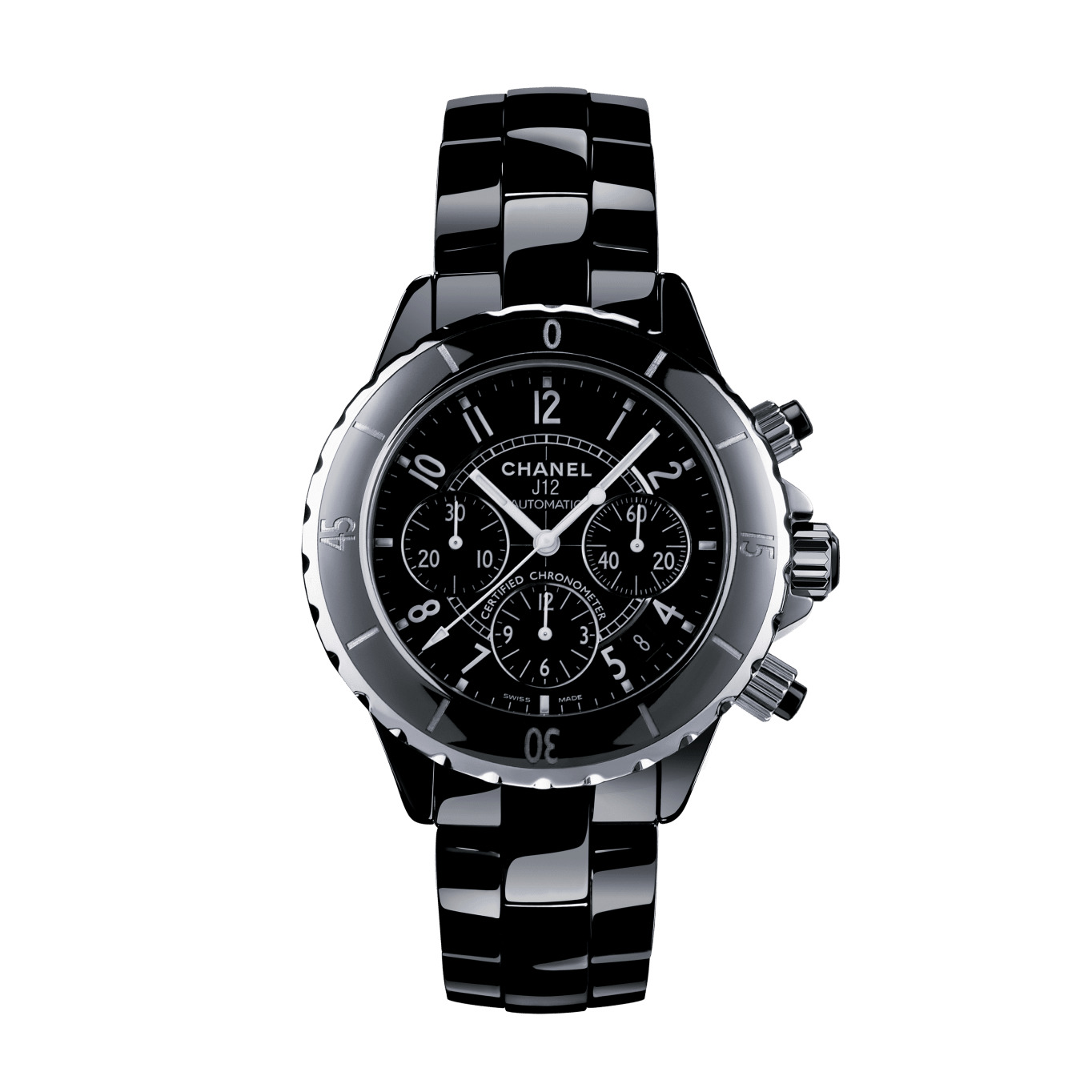 J12 Chronograph Watch, 41 mm, Black highly resistant ceramic and steel on the CHANEL website. Black highly resistant ceramic and steel
