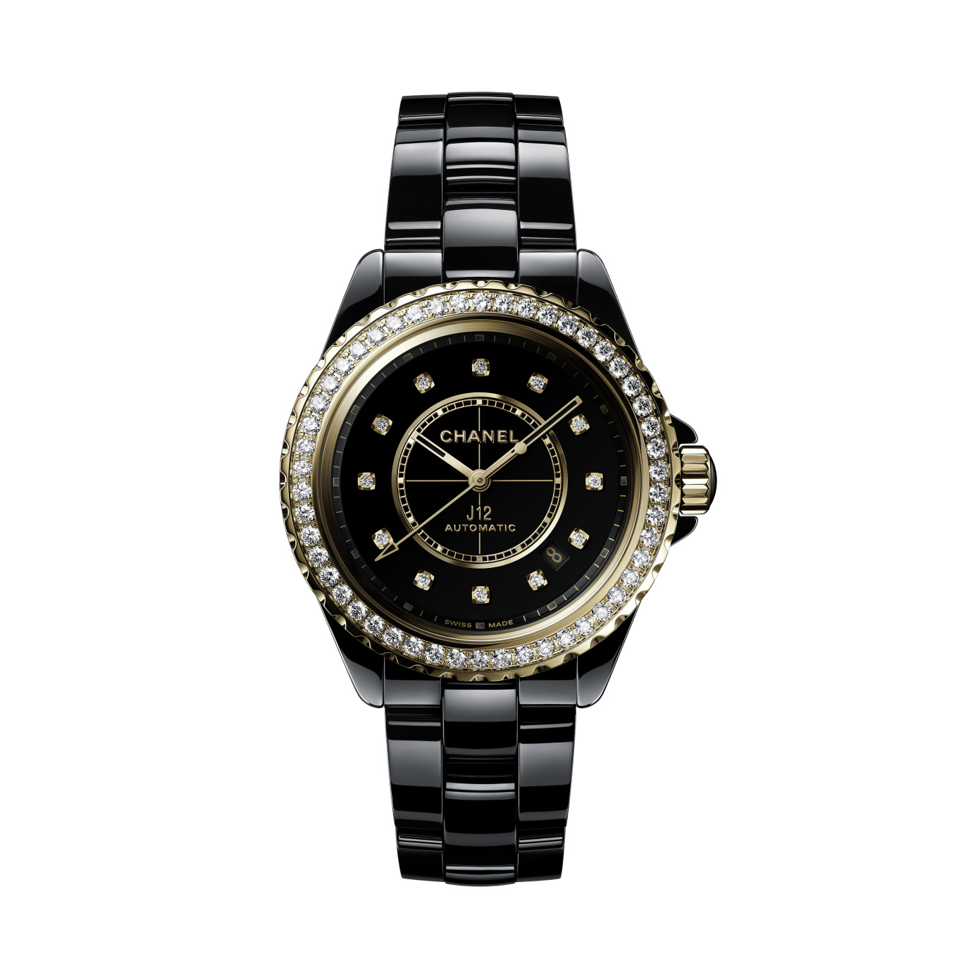 J12 Diamond Bezel Watch Caliber 12.1, 38 MM, Black highly resistant ceramic and 18K yellow gold, diamond bezel and indicators on the CHANEL website. Black highly resistant ceramic and 18K yellow gold, diamond bezel and indicators